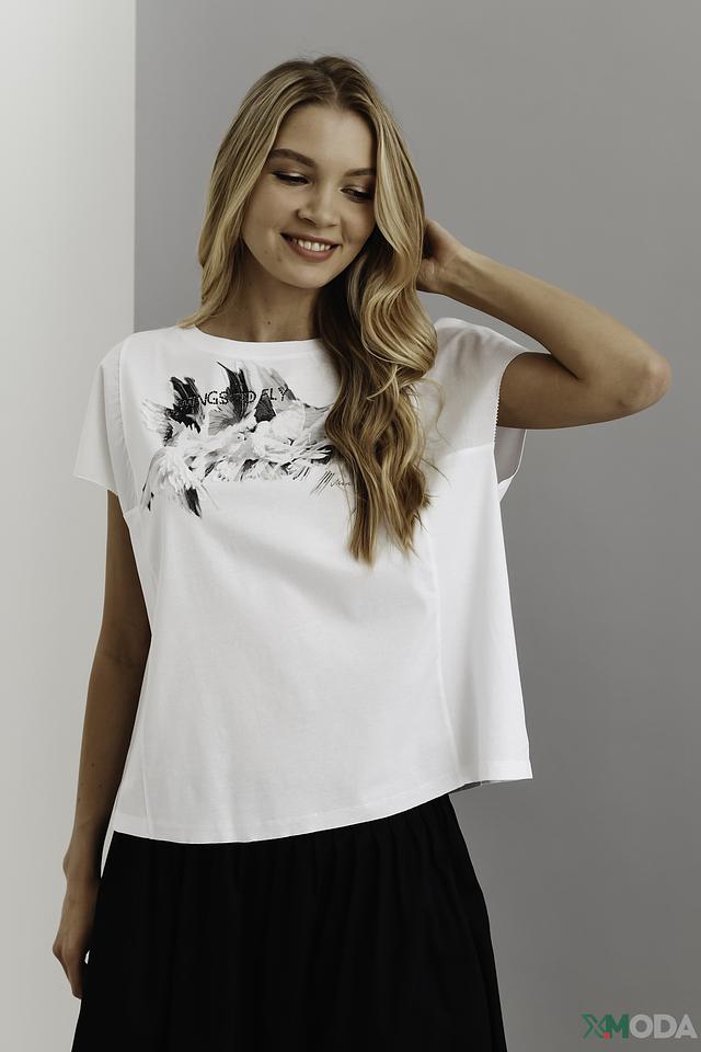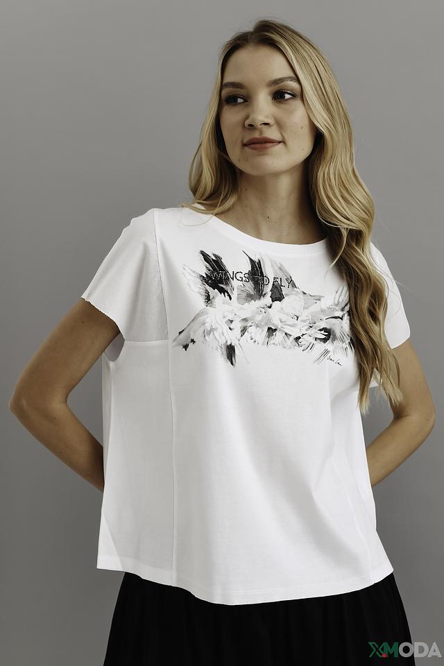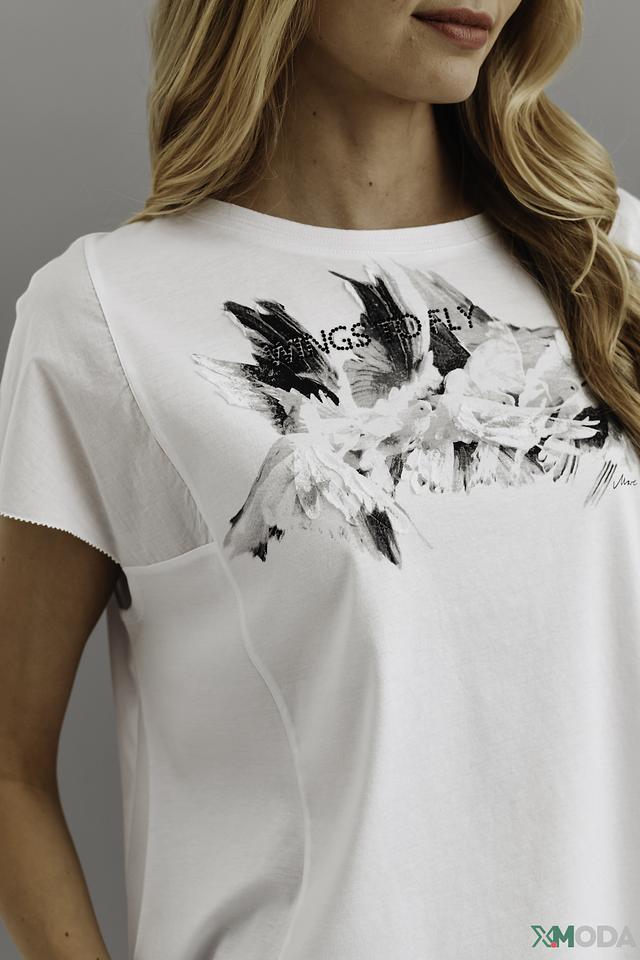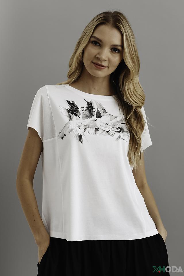 Белая футболка Marc Cain с оригинальным принтом – стильное и комфортное решение для повседневного образа. Изготовлена из 100% хлопка, обеспечивающего приятные ощущения на коже. Состав: хлопок 100%