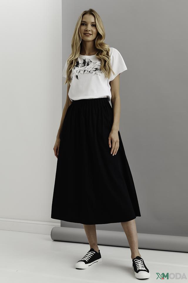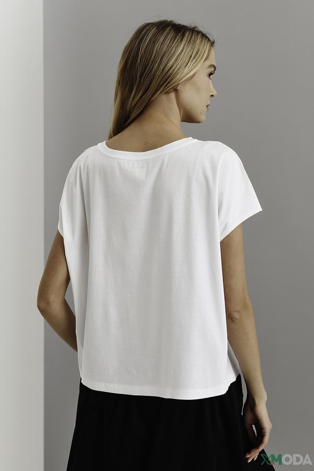 Футболка имеет свободный крой и короткие рукава, что обеспечивает свободу движений. V-образный вырез горловины подчеркивает женственность силуэта. Эта футболка идеально сочетается с джинсами, юбками или шортами, создавая непринужденный и стильный образ.