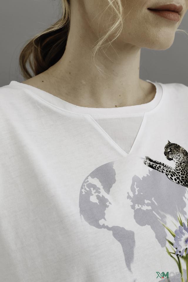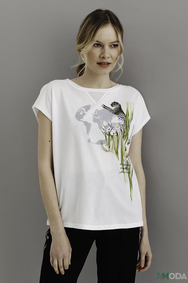 Белая футболка Marc Cain с ярким принтом леопарда и карты мира. Модель свободного кроя с короткими рукавами и V-образным вырезом, выполнена из 100% хлопка. Состав: хлопок 100%