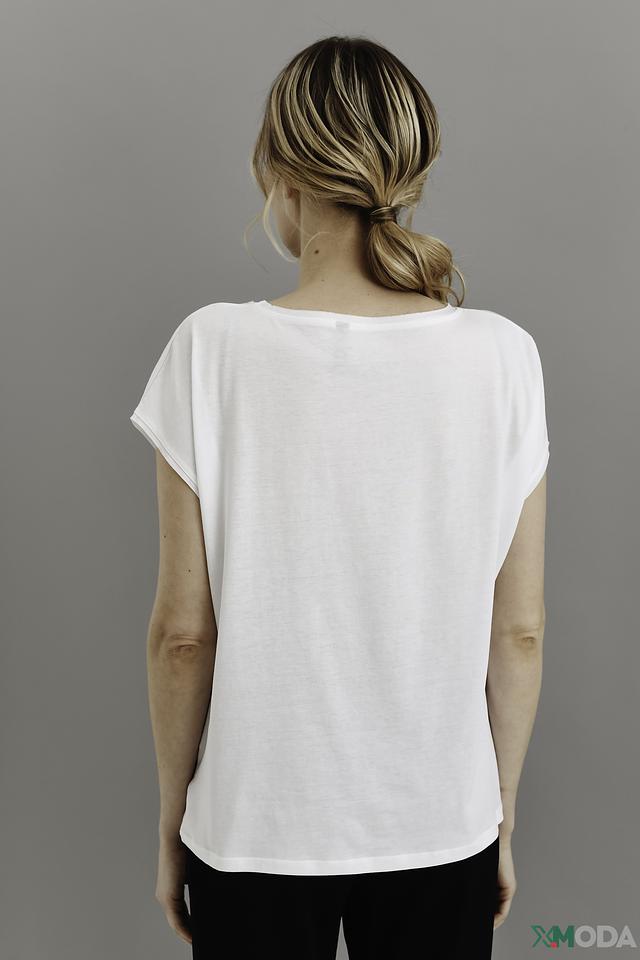 Модель имеет свободный крой, который обеспечивает комфорт и свободу движений. V-образный вырез подчеркивает линию шеи, а короткие рукава делают футболку идеальной для теплой погоды.