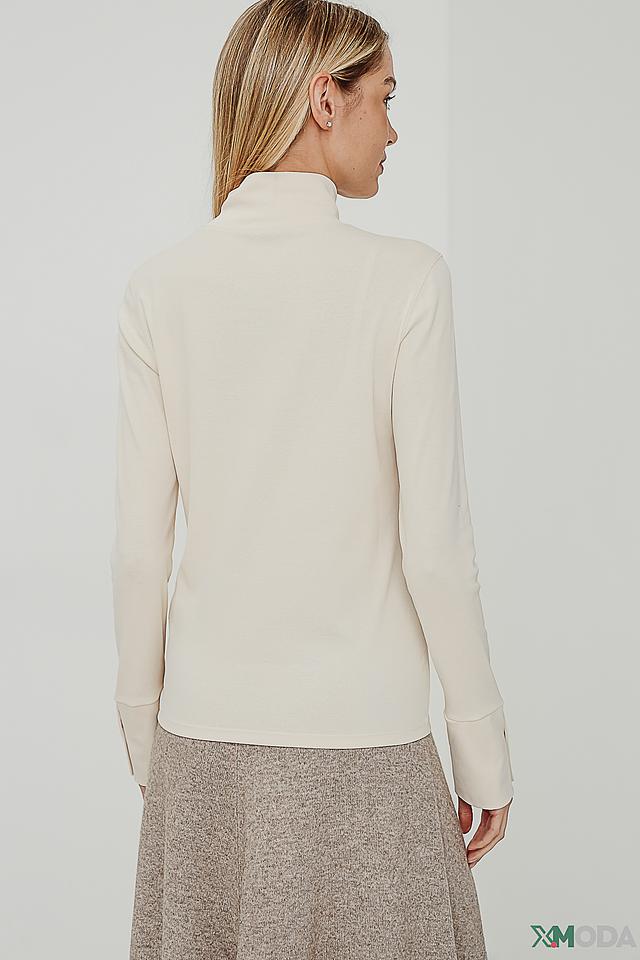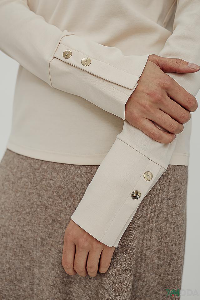 Бежевая блуза Marc Cain с длинными рукавами и аккуратным воротником-стойкой. Модель выполнена из мягкого трикотажа с добавлением эластана для комфортной посадки и украшена декоративными пуговицами на манжетах. Состав: хлопок 95%, эластан 5%