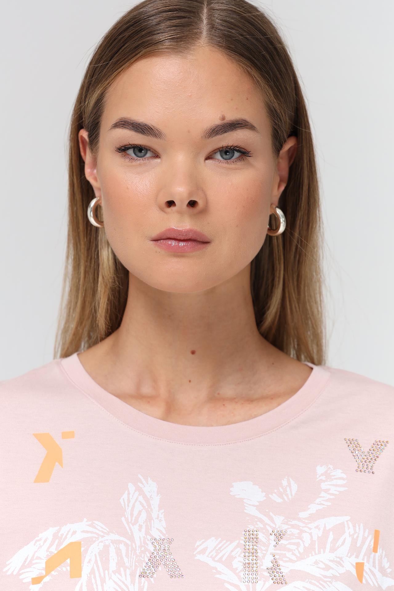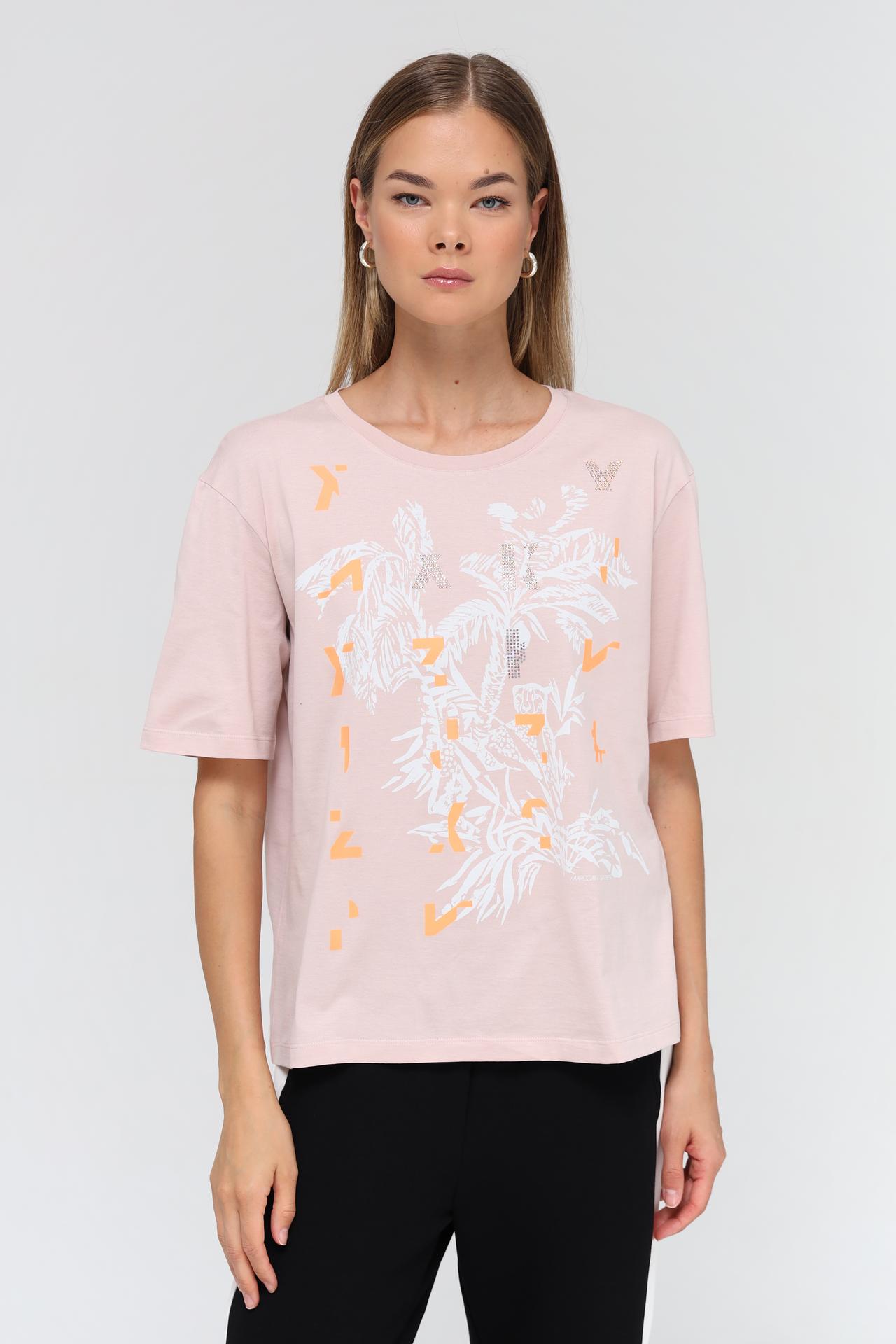 Модель выполнена в нежном пудровом цвете и украшена оригинальным принтом с изображением пальм и абстрактных элементов. Принт выполнен в технике печати с добавлением страз, что добавляет футболке изюминку и делает ее ещё более привлекательной.