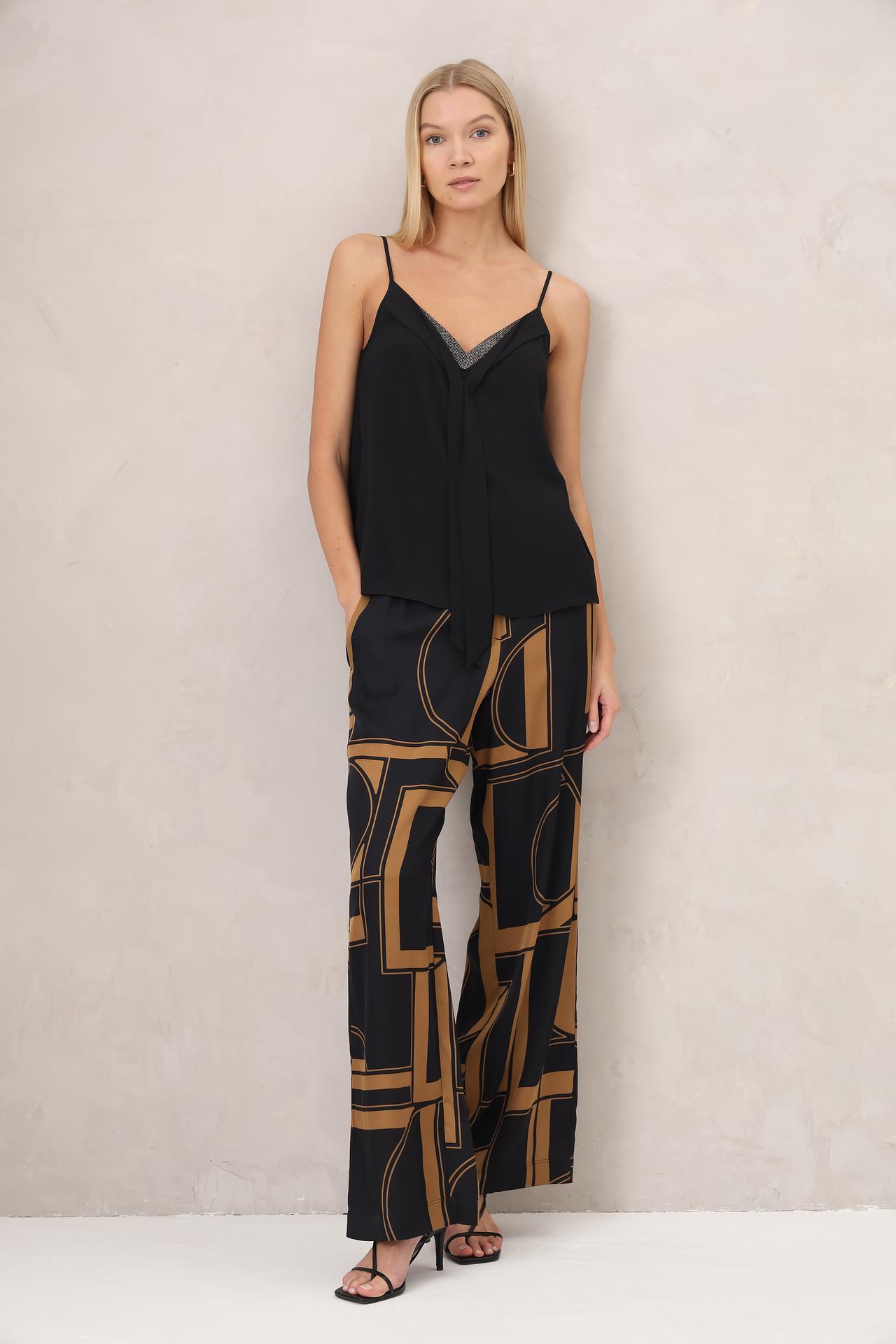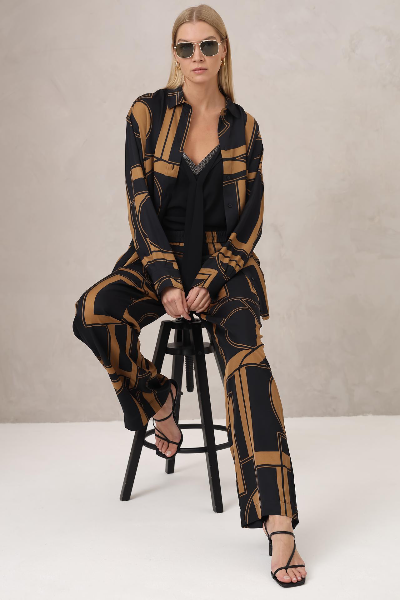 - Дизайн: Эксклюзивный геометрический принт. Яркий и запоминающийся узор в черно-золотистых тонах привлекает внимание и подчеркивает индивидуальность.