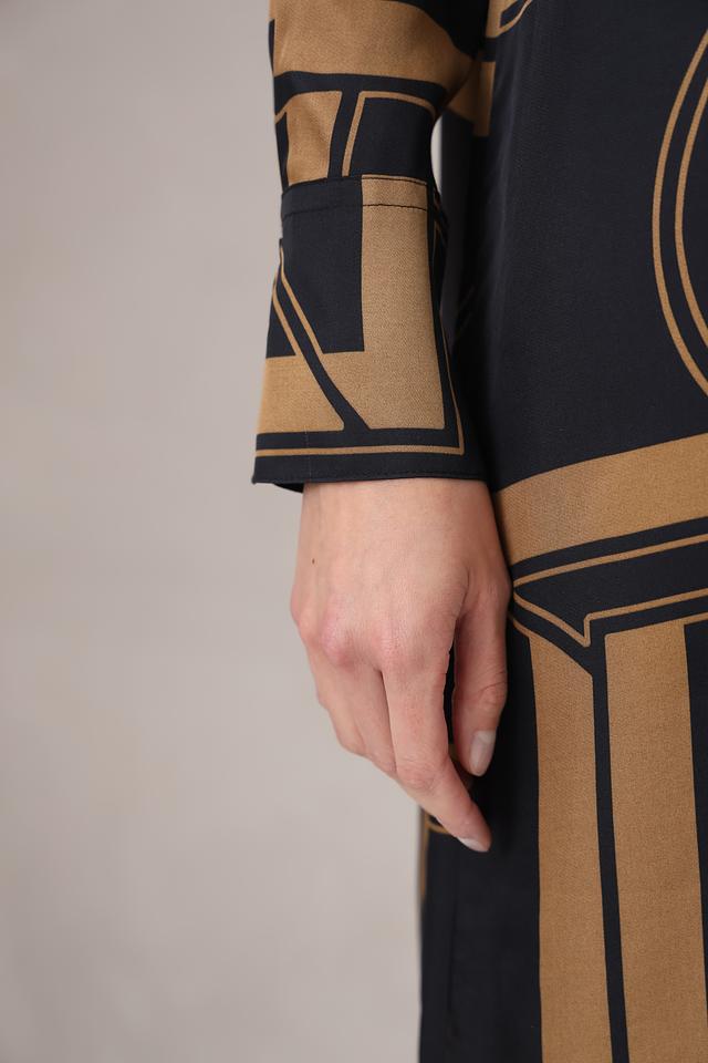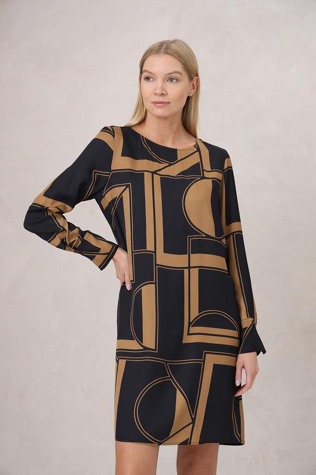 Дизайн платья представлен в виде геометрического принта, сочетающего в себе черные и золотистые оттенки. Прямой крой платья подчеркивает фигуру, а длинные рукава делают его подходящим для прохладной погоды.