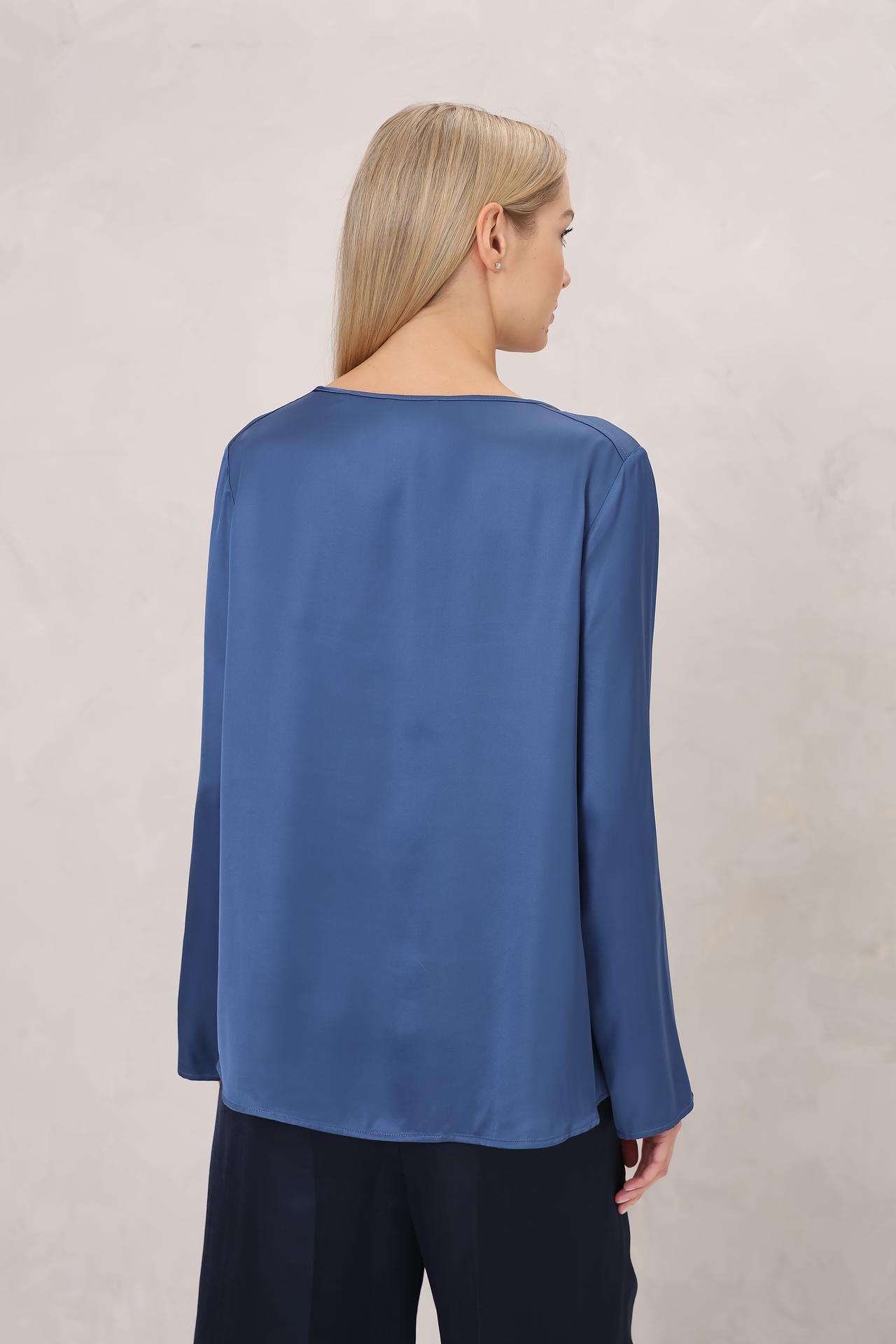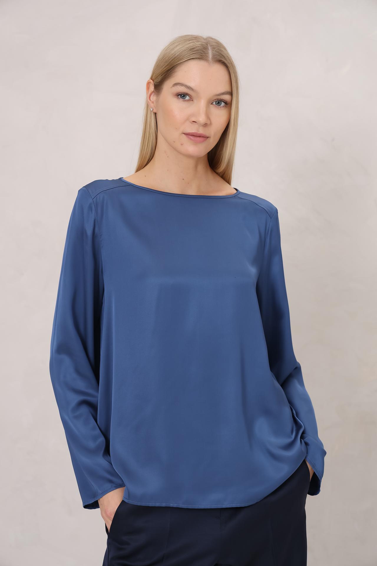 - Элегантный крой: Блуза имеет классический свободный крой с длинными рукавами и вырезом «лодочка», который изящно открывает шею. Это универсальное решение подходит для различных типов фигур и позволяет создавать многослойные образы.