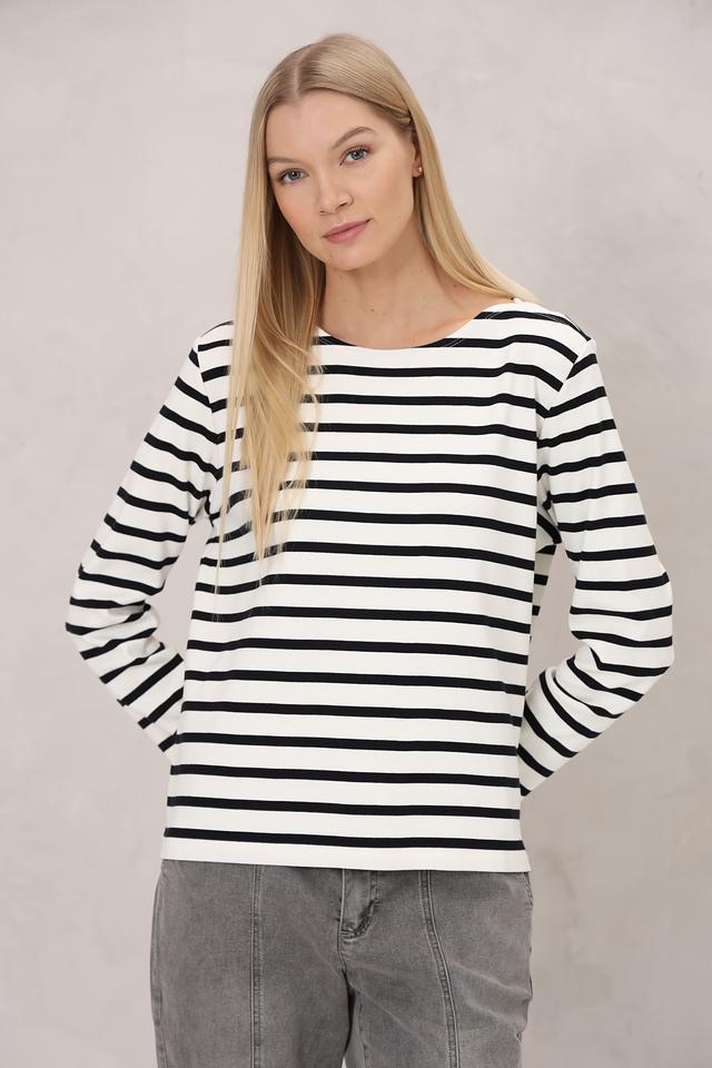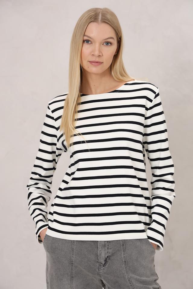 Классический крой и универсальная бело-чёрная полоска делают этот пуловер подходящим для создания различных образов – от повседневных до более элегантных. Округлый вырез горловины и длинные рукава добавляют модели практичности и удобства.