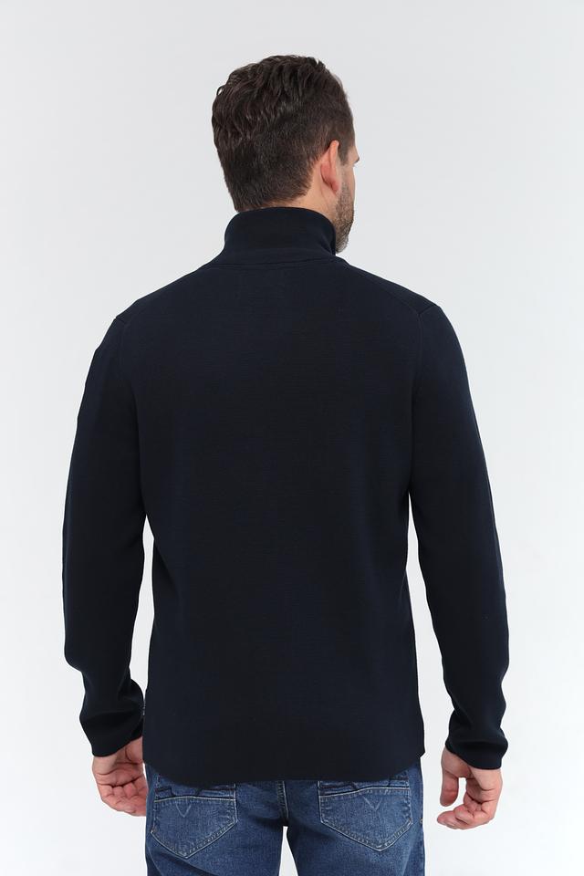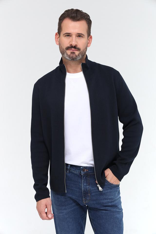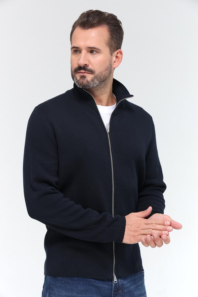Кардиган имеет тёмно-синий цвет, который легко сочетается с различными элементами одежды. Застёжка на молнии обеспечивает удобство и практичность. Изготовлен кардиган из высококачественного хлопка, что гарантирует комфорт и приятные ощущения при носке.