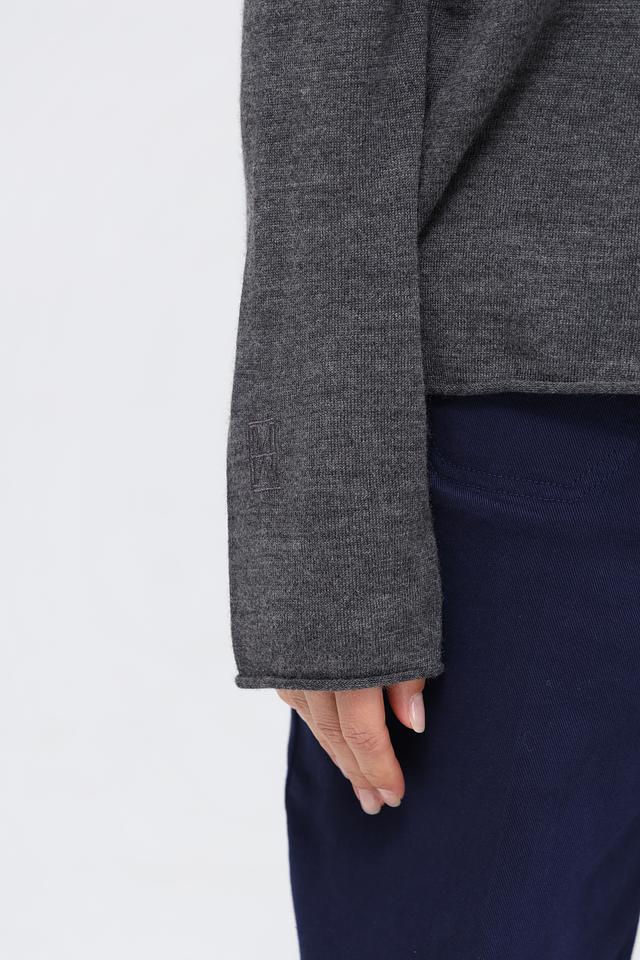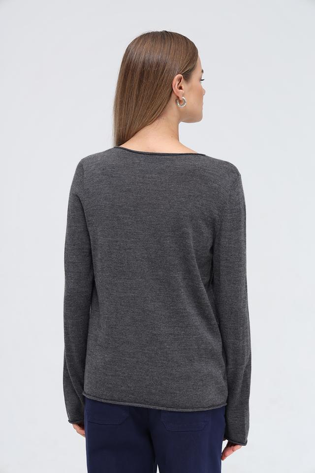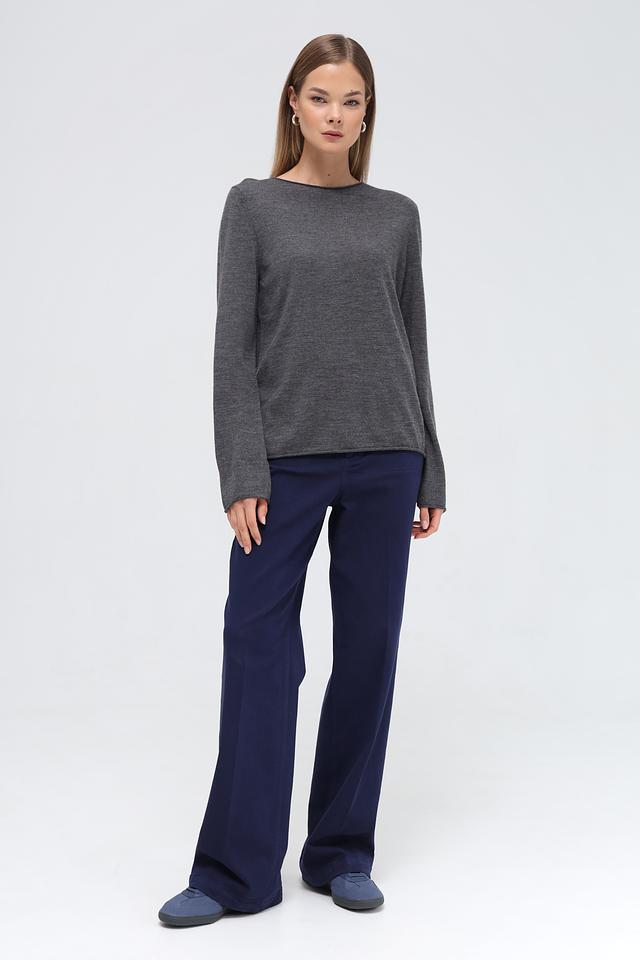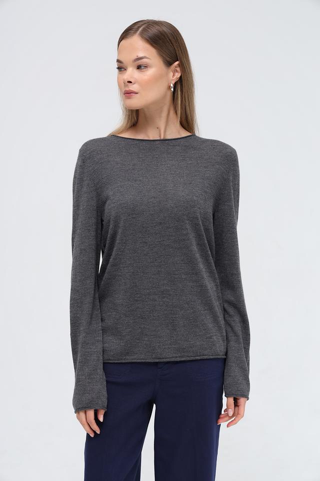Модель имеет прямой крой, круглый вырез горловины и длинные рукава. Пуловер выполнен в спокойном сером цвете, который легко сочетается с различными элементами гардероба.