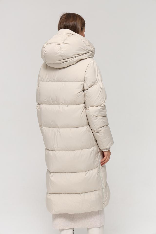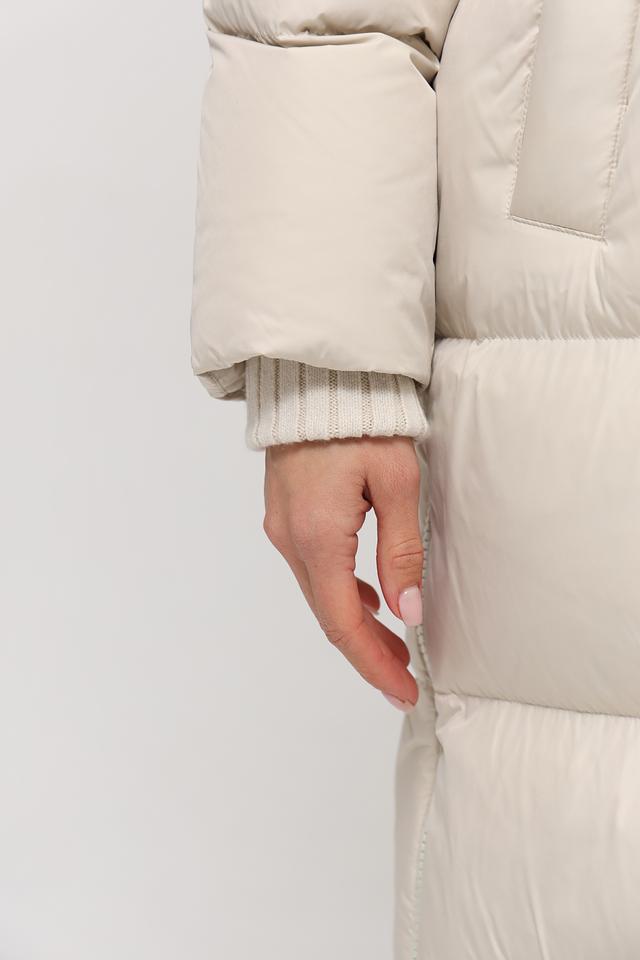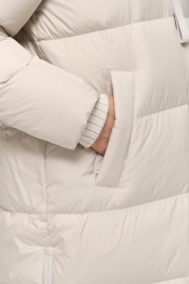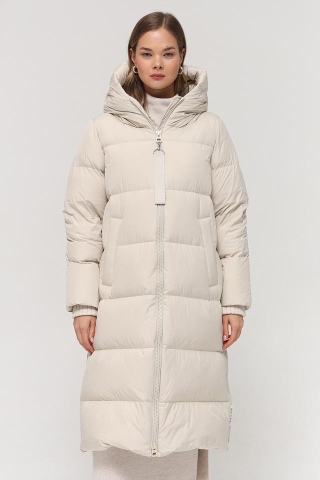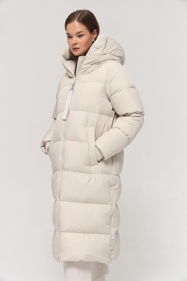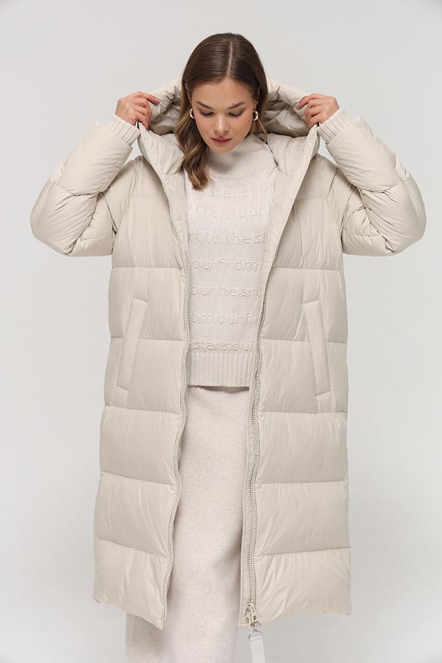 Данная модель выполнена в нежном бежевом цвете и имеет стеганую текстуру, которая придает ей особый шарм. Пальто имеет прямой крой, который обеспечивает свободу движений, а также удобный капюшон, защищающий от непогоды.