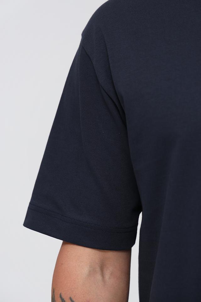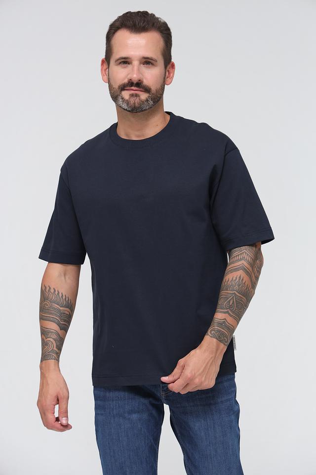 Цвет футболки – насыщенный тёмно-синий, что делает её легко сочетаемой с различными элементами гардероба. Круглый вырез горловины и короткие рукава обеспечивают удобство в носке. Отсутствие каких-либо принтов или логотипов делает эту футболку особенно универсальной.