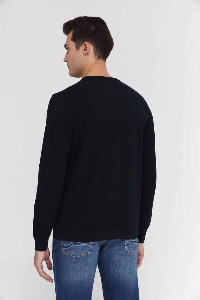 Цвет джемпера – насыщенный чёрный, что позволяет легко сочетать его с различными элементами одежды. На груди расположен небольшой логотип бренда, выполненный в тон изделия. Этот джемпер станет незаменимой вещью в вашем гардеробе, подходящей для создания как повседневных, так и более формальных образов.