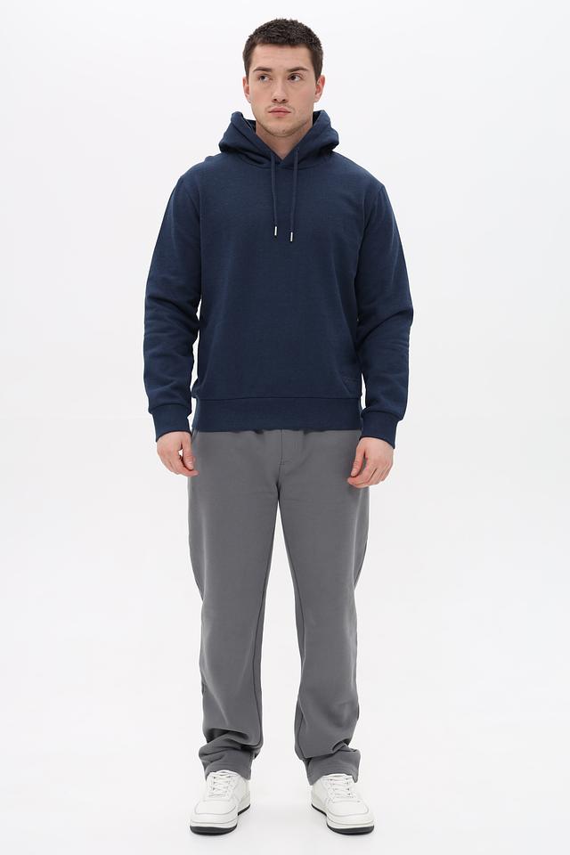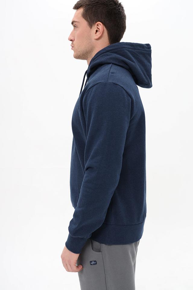 Модель имеет классический крой с капюшоном и карманами. Синий цвет толстовки универсален и легко сочетается с другими элементами гардероба.