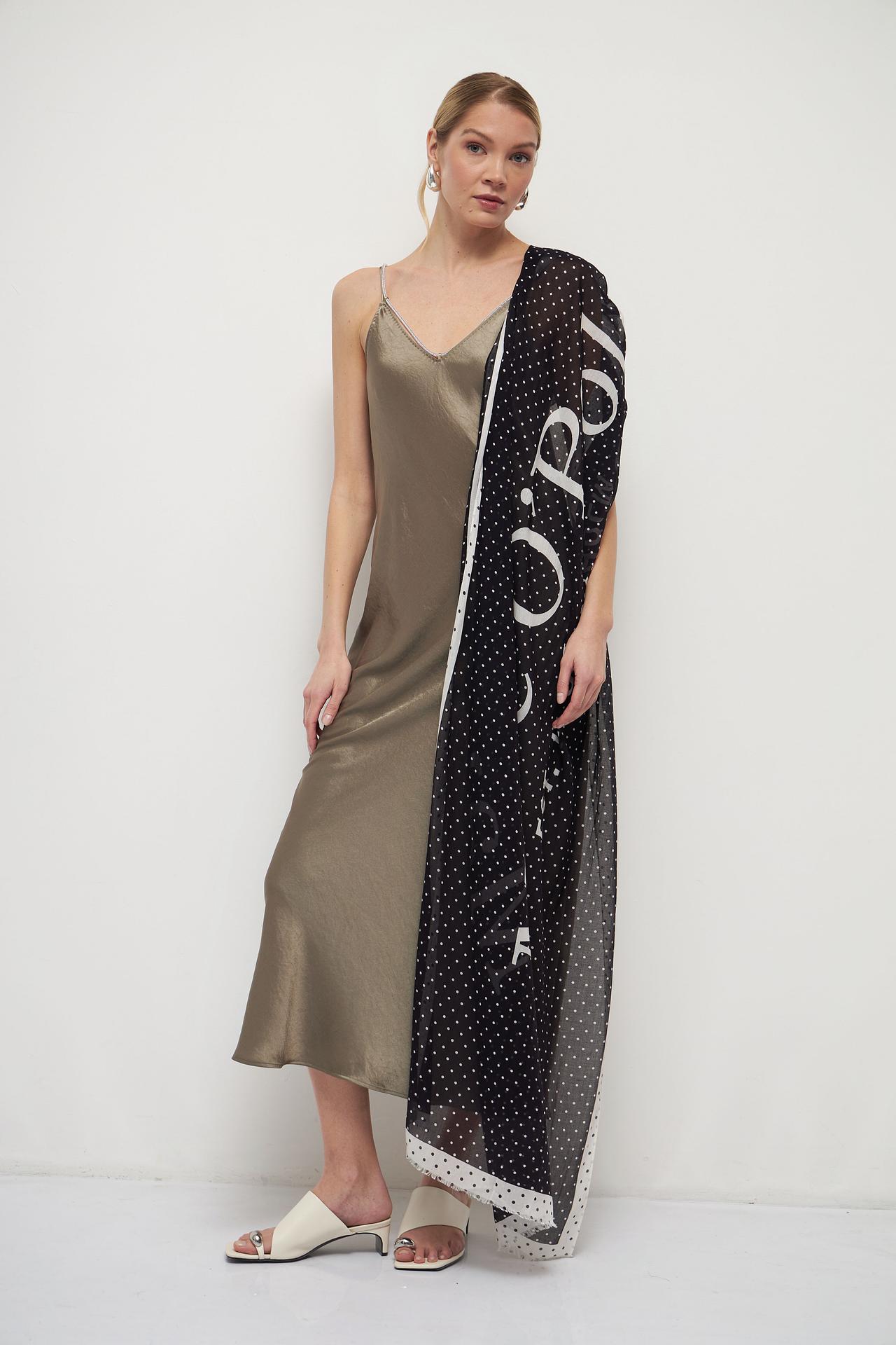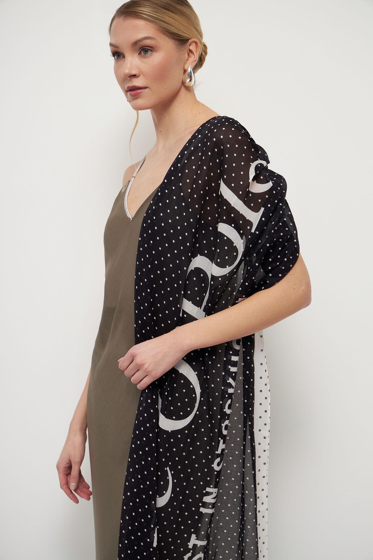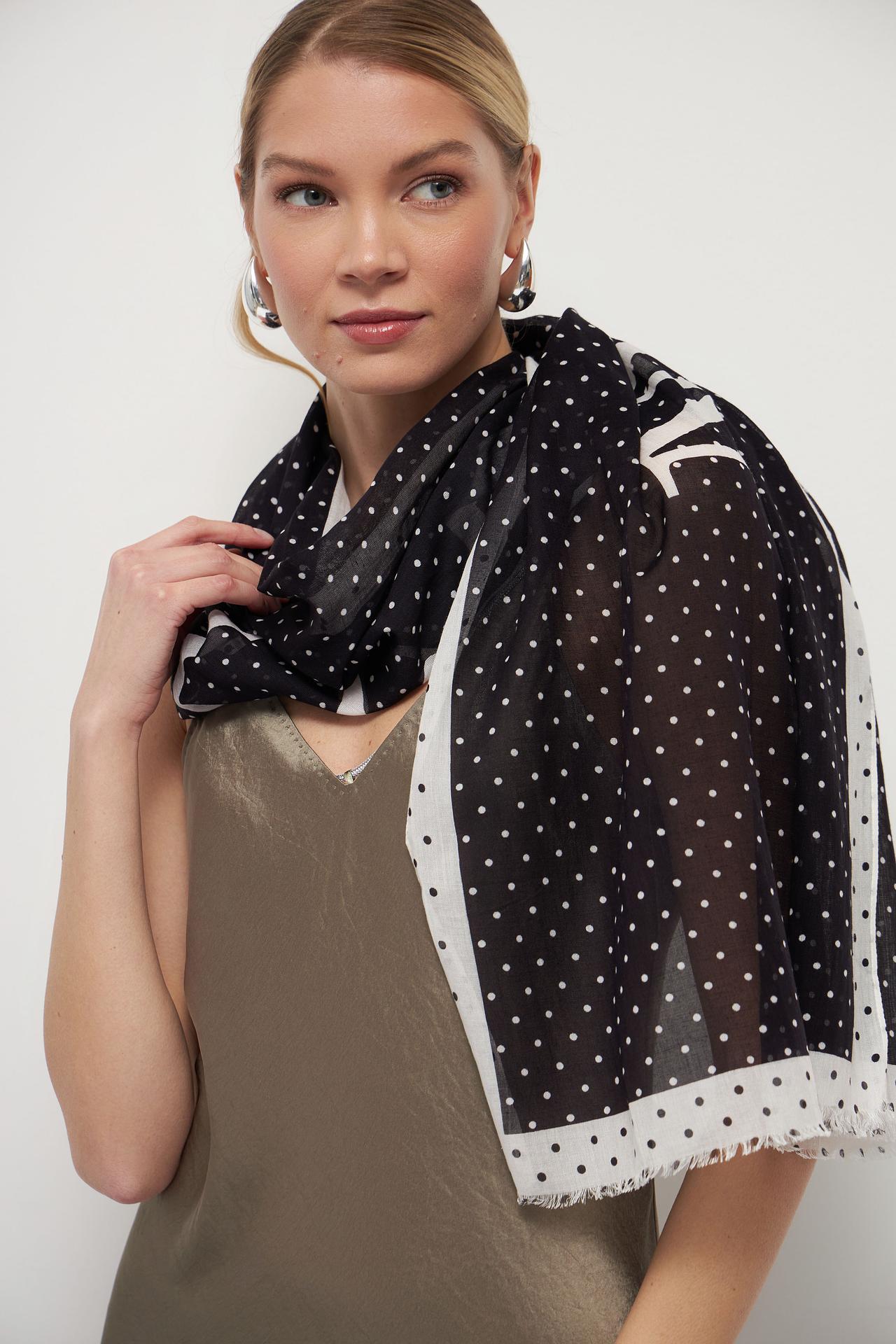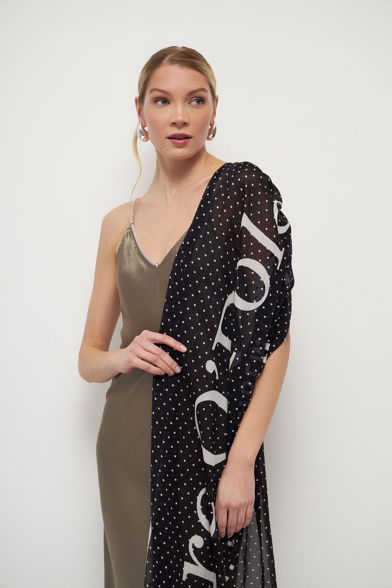 - Дизайн: Оригинальный принт в горошек с крупной надписью бренда. Шарф украшен контрастной полосой и бахромой по краям, добавляя текстуры и интереса.