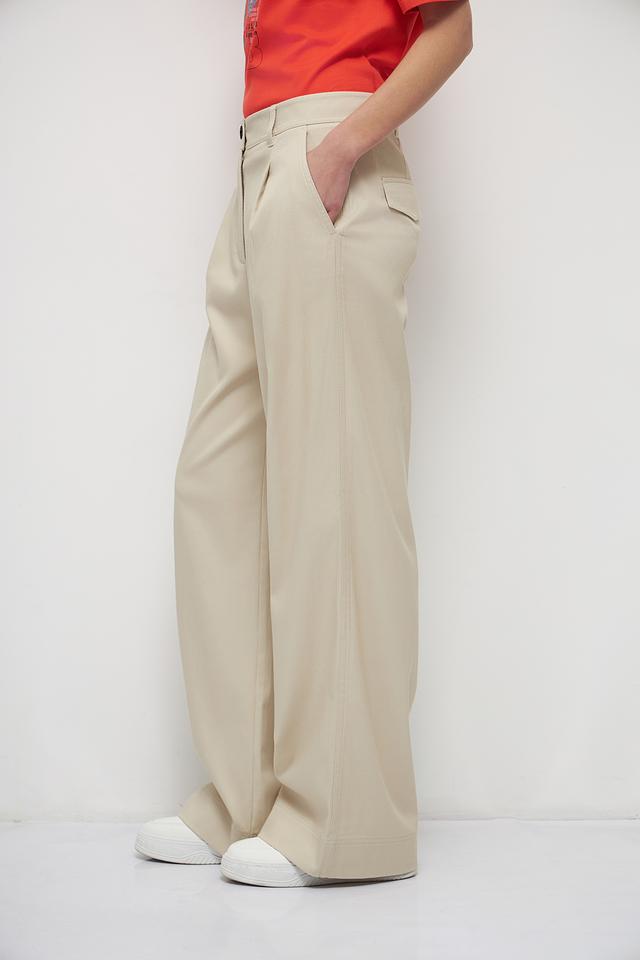 Брюки имеют прямой крой и высокую посадку, что обеспечивает комфортную посадку по фигуре и свободу движений. Модель дополнена аккуратными складками спереди, которые придают ей элегантный вид.