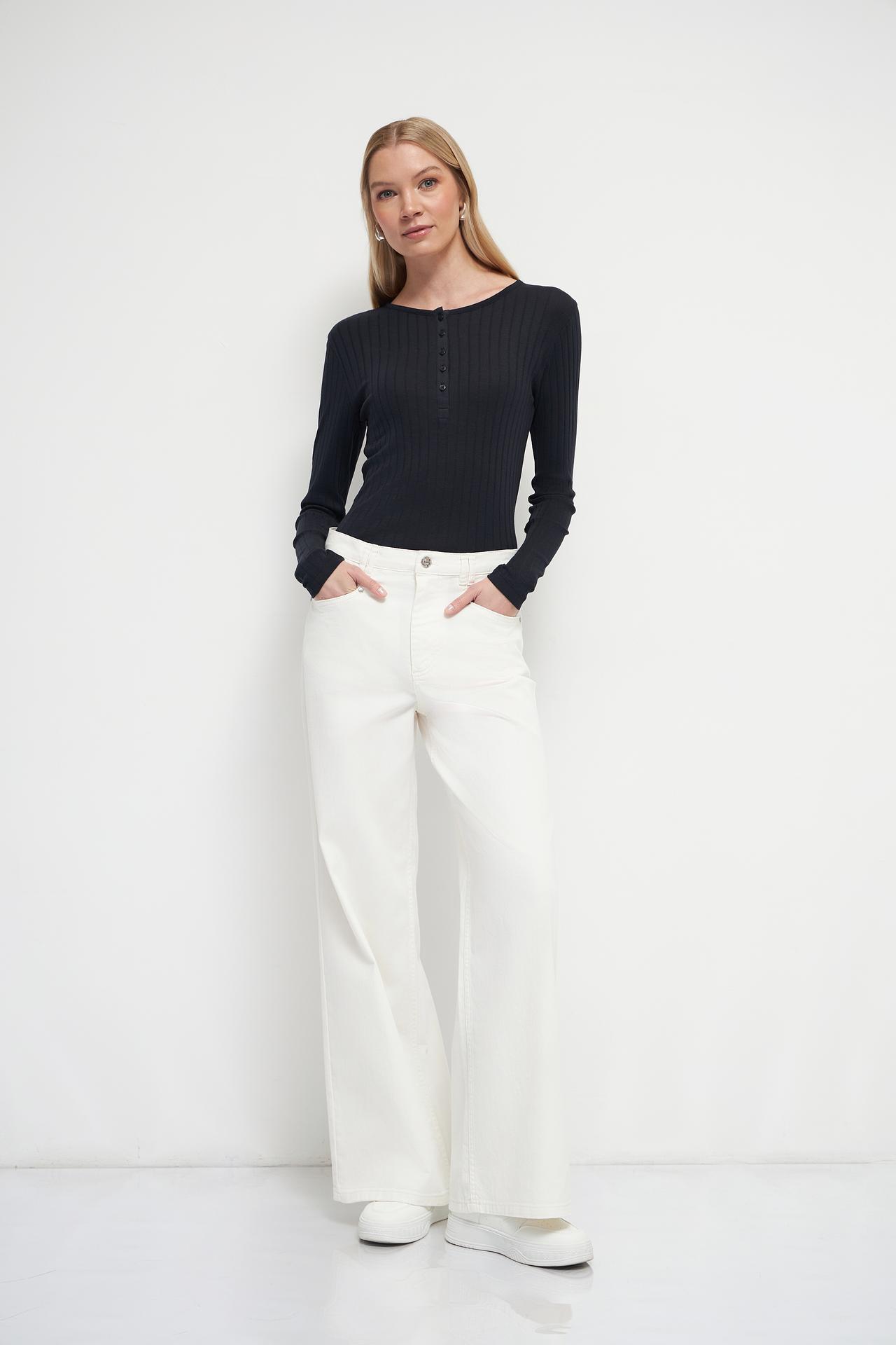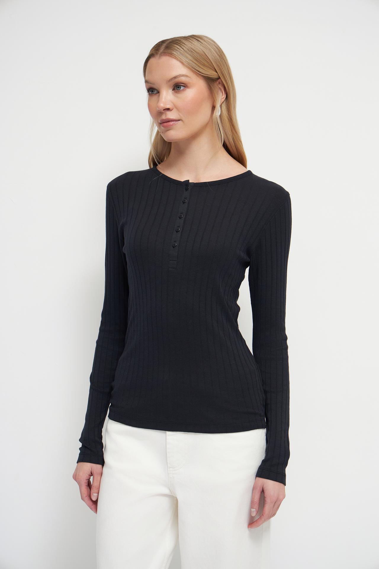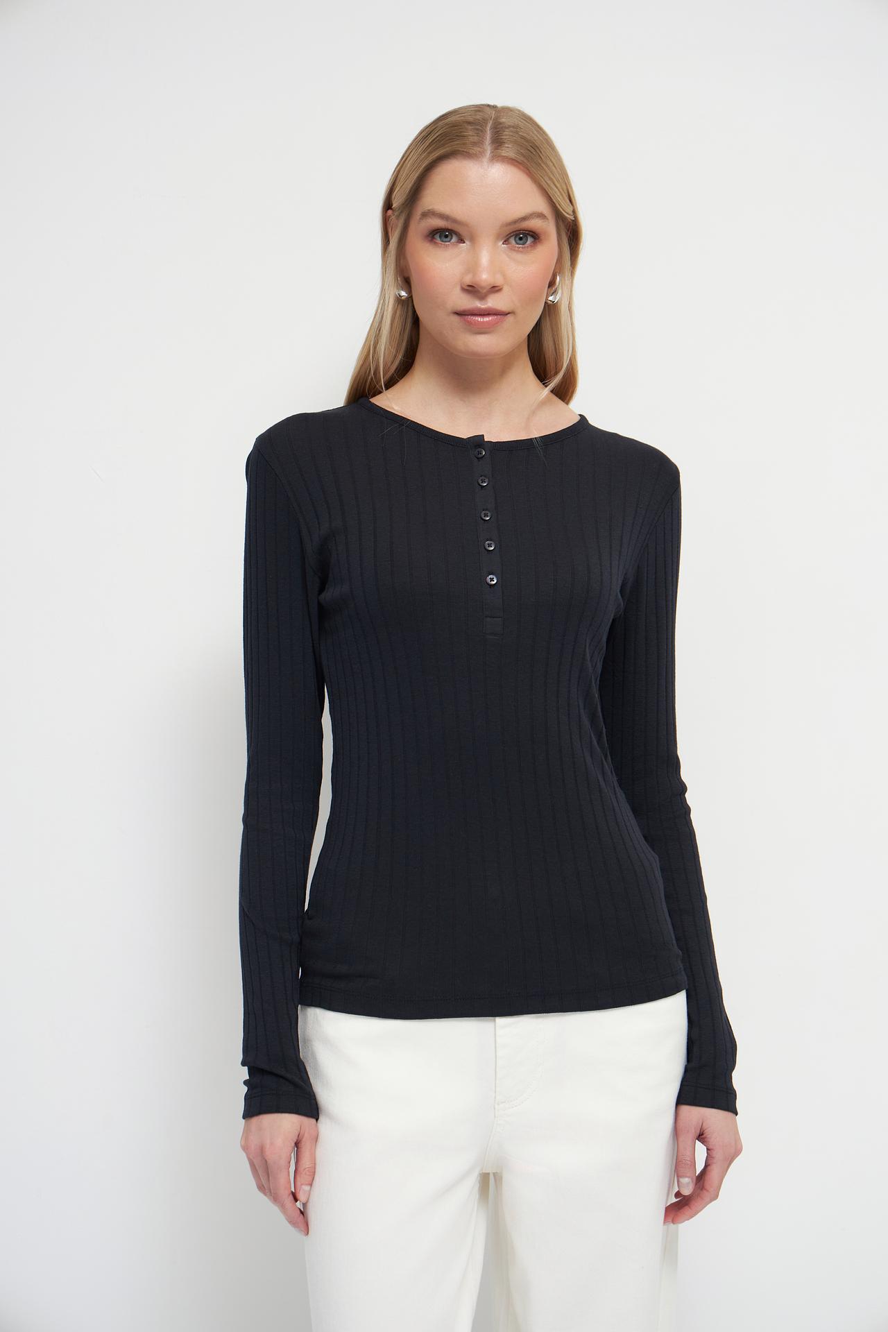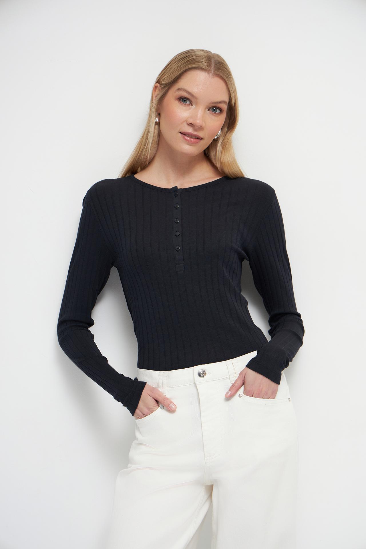 - Дизайн: Лонгслив имеет круглый вырез с планкой на пуговицах, что добавляет изюминку классическому силуэту. Тонкая вертикальная полоска визуально вытягивает фигуру.