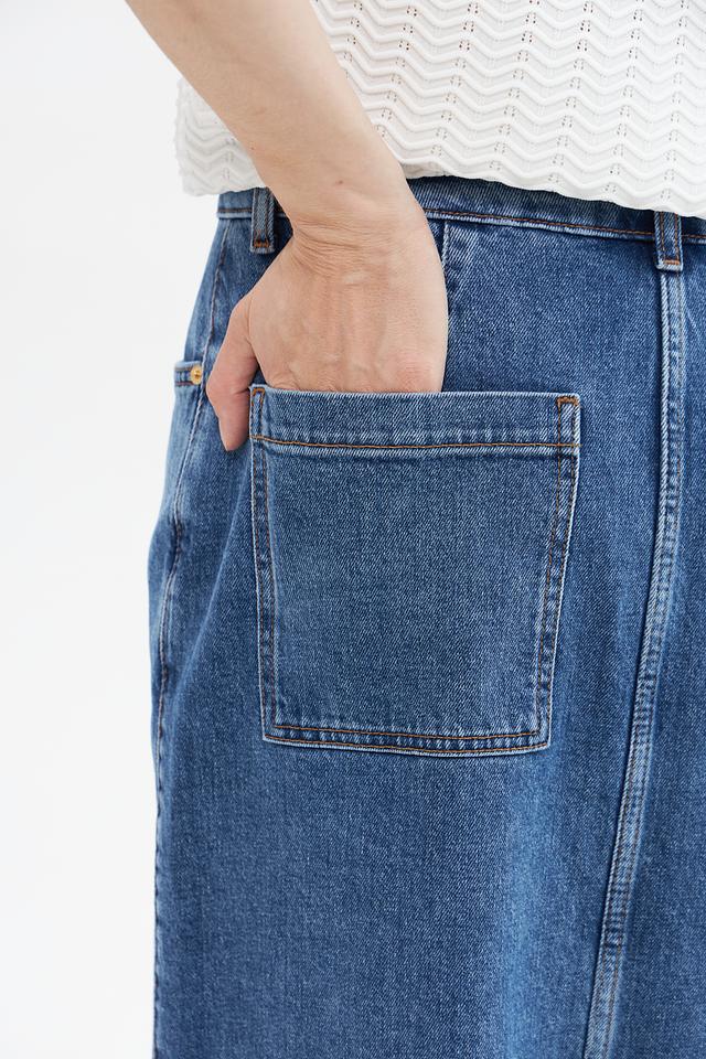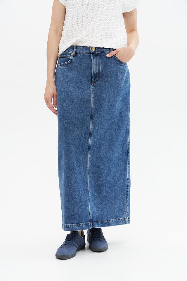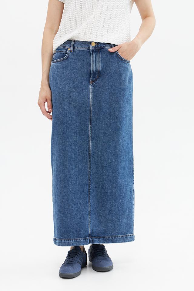 Юбка имеет прямой крой и длину макси, что делает ее универсальной и подходящей для различных типов фигуры. Классический синий цвет и традиционная джинсовая фактура позволяют легко сочетать эту юбку с различными элементами гардероба – от простых футболок до элегантных блузок.