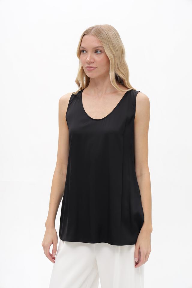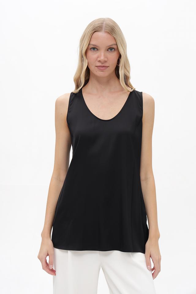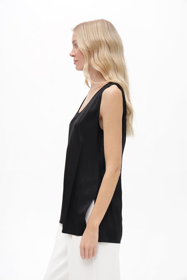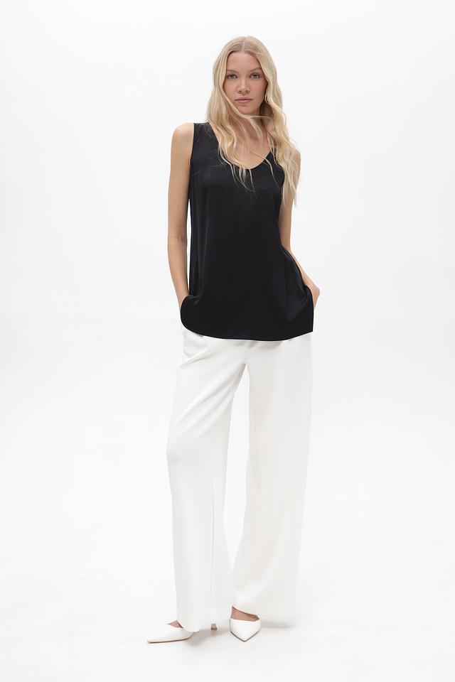 Топ имеет прямой, слегка свободный крой, который не сковывает движений и позволяет создать расслабленный образ. V-образный вырез горловины и тонкие бретельки придают модели женственность и элегантность.