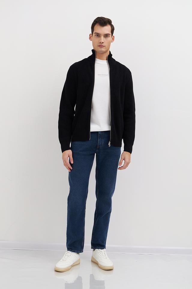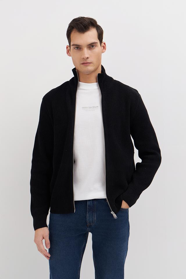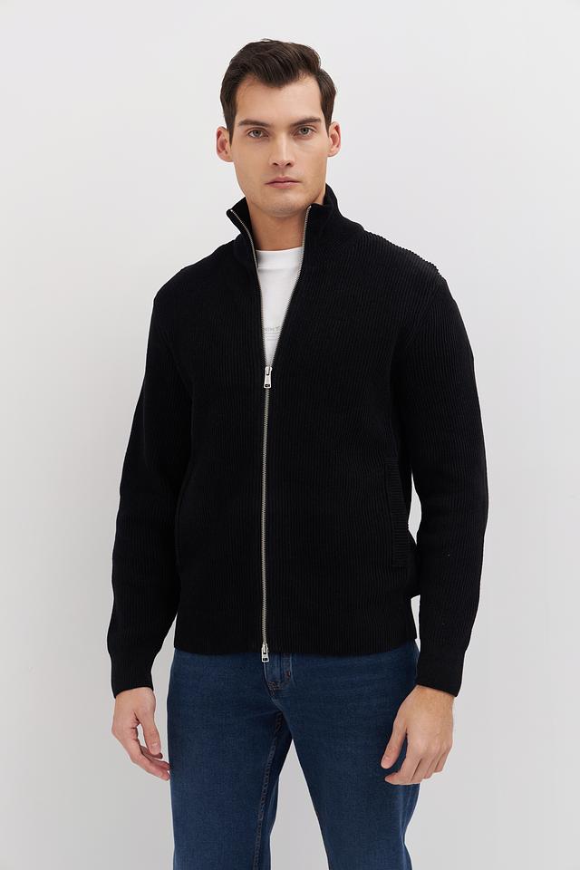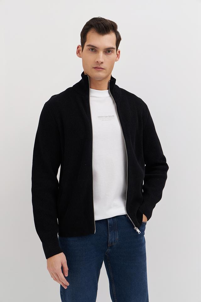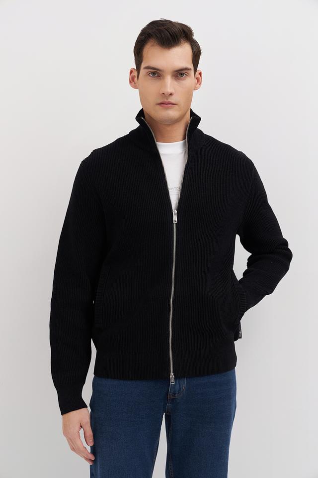 Кардиган имеет воротник-стойку и два боковых кармана. Плотная вязка придает изделию форму и обеспечивает дополнительное тепло. Чёрный цвет делает кардиган универсальным и легко сочетаемым с различными элементами гардероба.