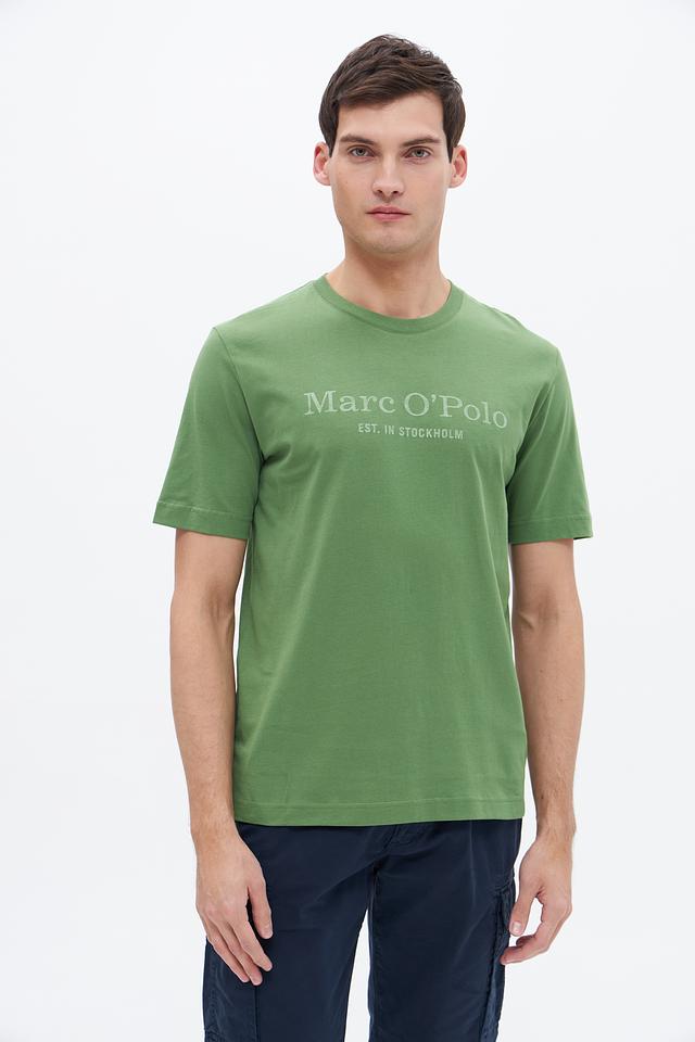Футболка имеет классический прямой крой, который подходит для любого типа фигуры. Оливковый цвет придает ей элегантный и современный вид. На груди размещен логотип бренда Marc O Polo и надпись "EST. IN STOCKHOLM", выполненные в тон изделия, что добавляет сдержанности и лаконичности.
