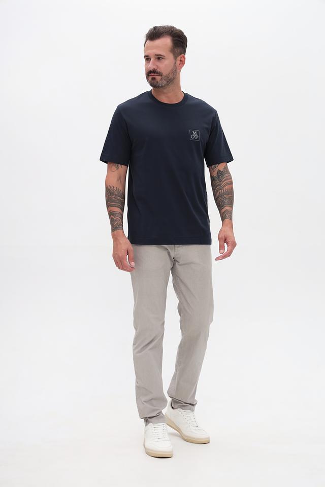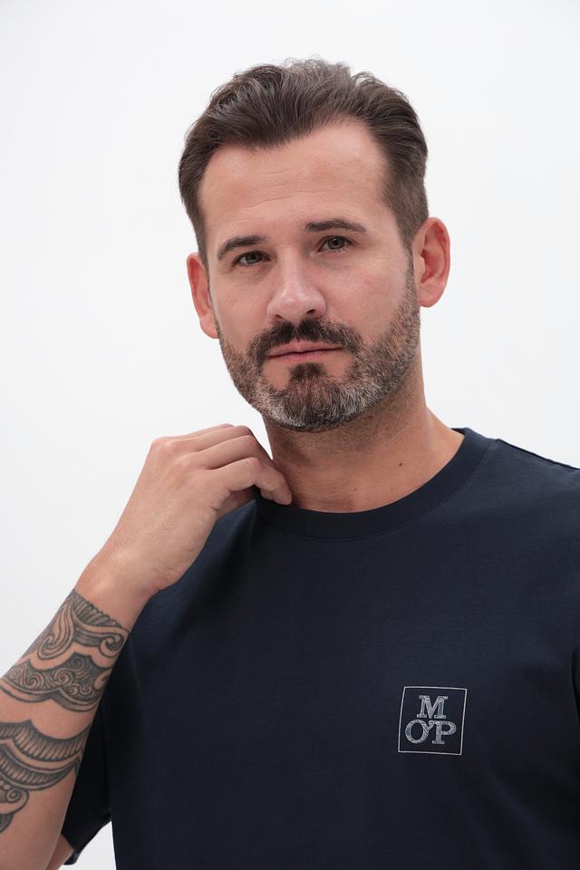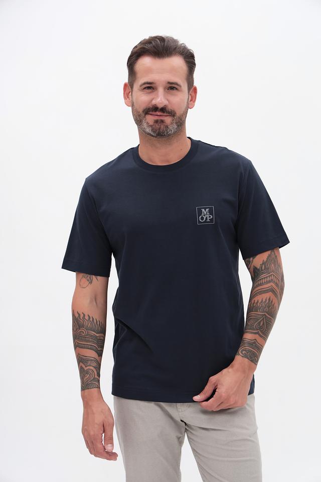Основной цвет футболки – navy, глубокий и насыщенный оттенок синего. На груди расположен небольшой логотип бренда Marc O Polo, выполненный в контрастном цвете, что добавляет модели стильный акцент.