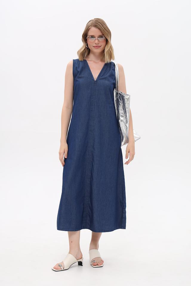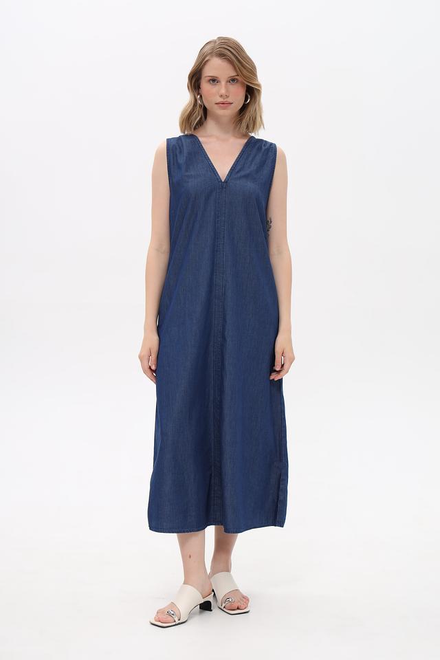 Модель имеет прямой, свободный крой, который не сковывает движений и обеспечивает максимальный комфорт в течение дня. V-образный вырез горловины подчеркивает линию шеи и декольте, а отсутствие рукавов делает платье идеальным выбором для теплой погоды. Длина миди придает образу элегантность и женственность.