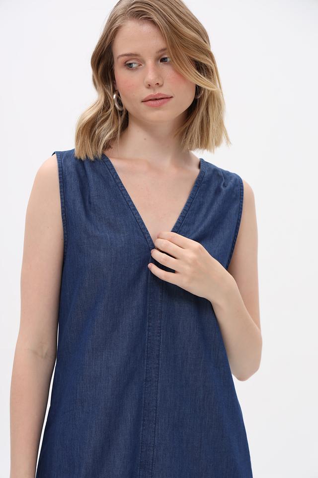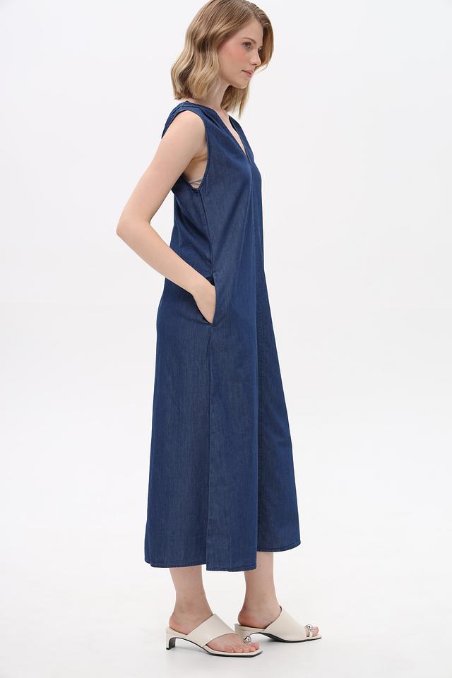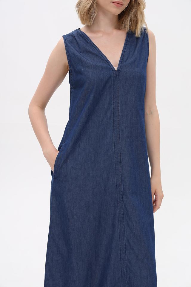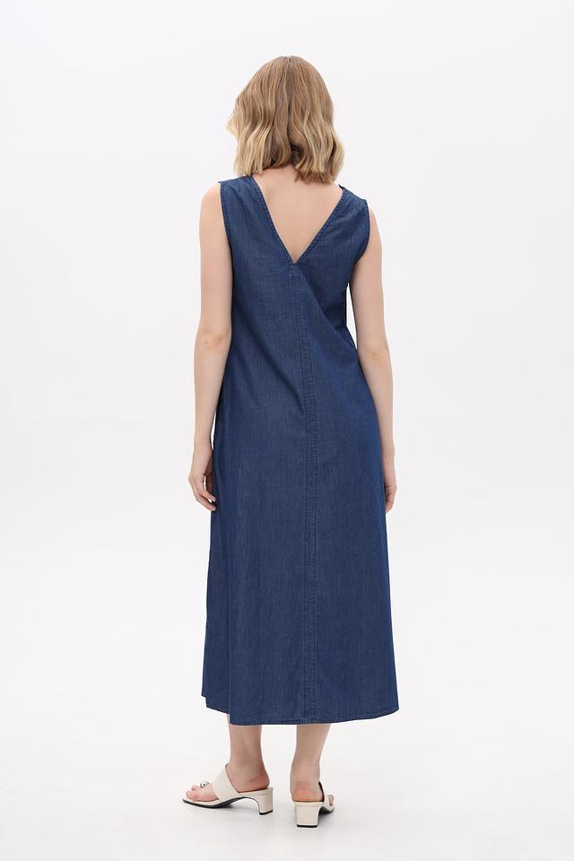 Платье дополнено удобными боковыми карманами. Ткань платья имеет характерную джинсовую текстуру. Состав: хлопок 82%, лиоцел 18%.