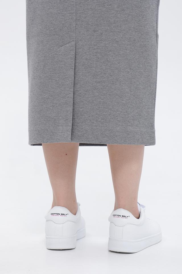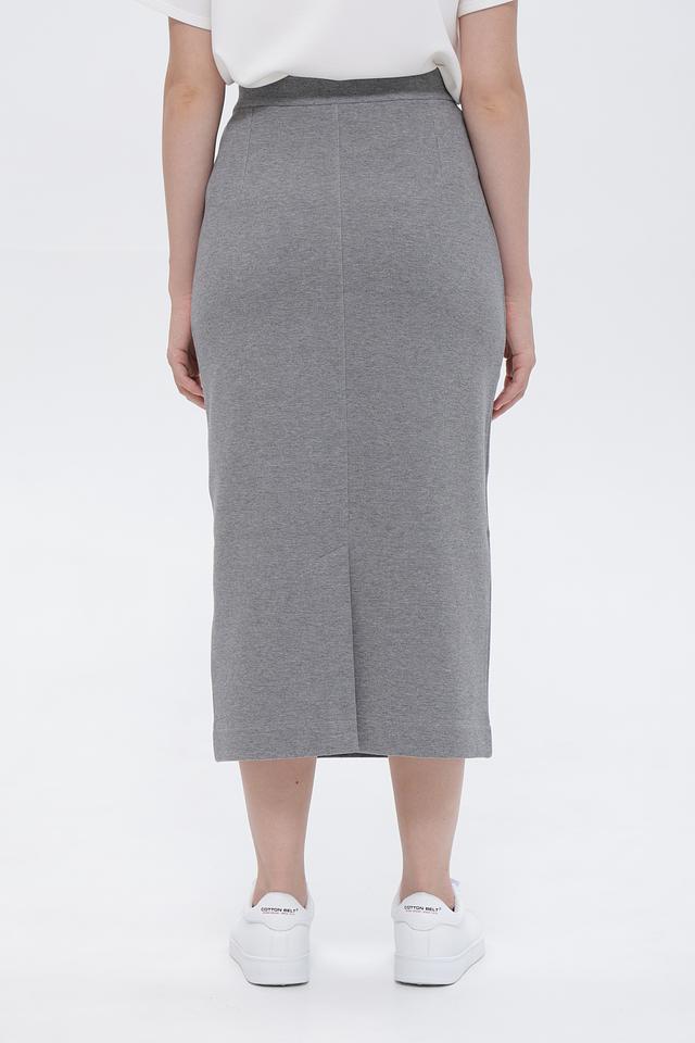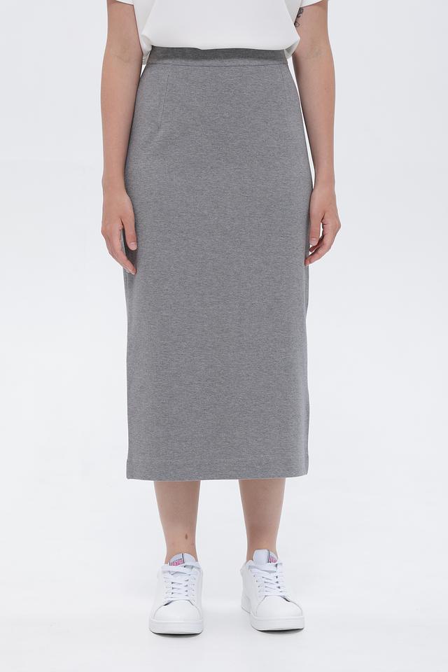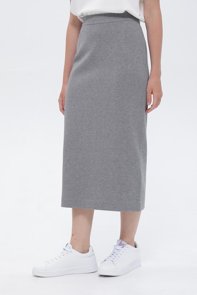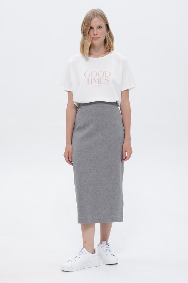 Модель имеет прилегающий силуэт и эластичный пояс, обеспечивающий комфортную посадку по фигуре. Юбка выполнена в сером цвете с деликатной текстурой, которая придает ей более изысканный вид.