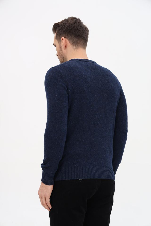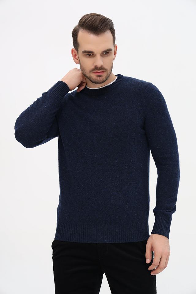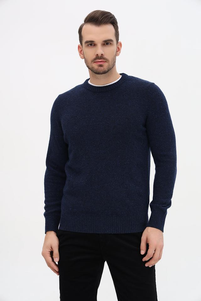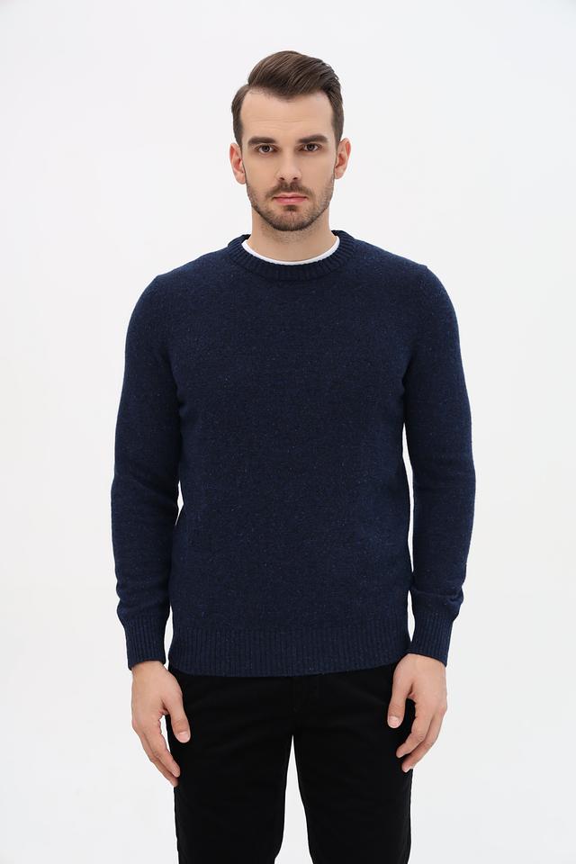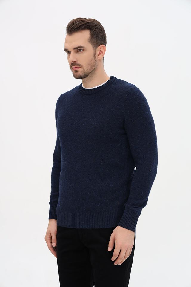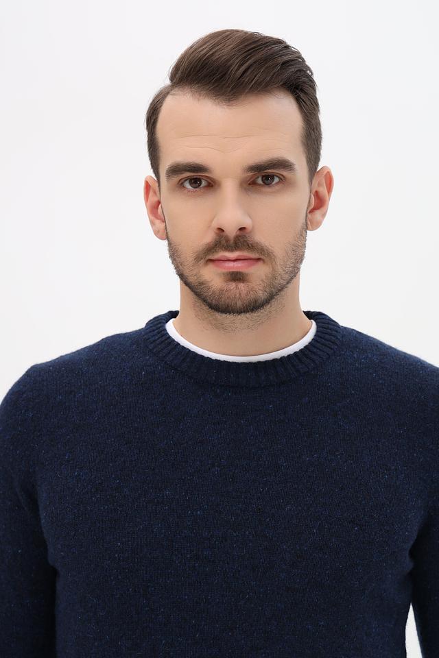 Джемпер имеет прямой крой, круглый вырез горловины и длинные рукава с манжетами. Текстура ткани выполнена в виде мелкой вязки с небольшим эффектом крапления, что придает изделию более интересный вид.
