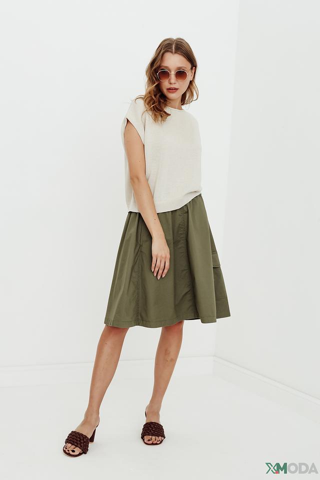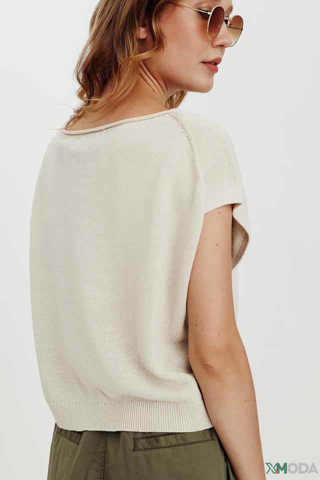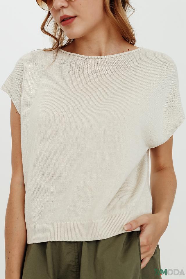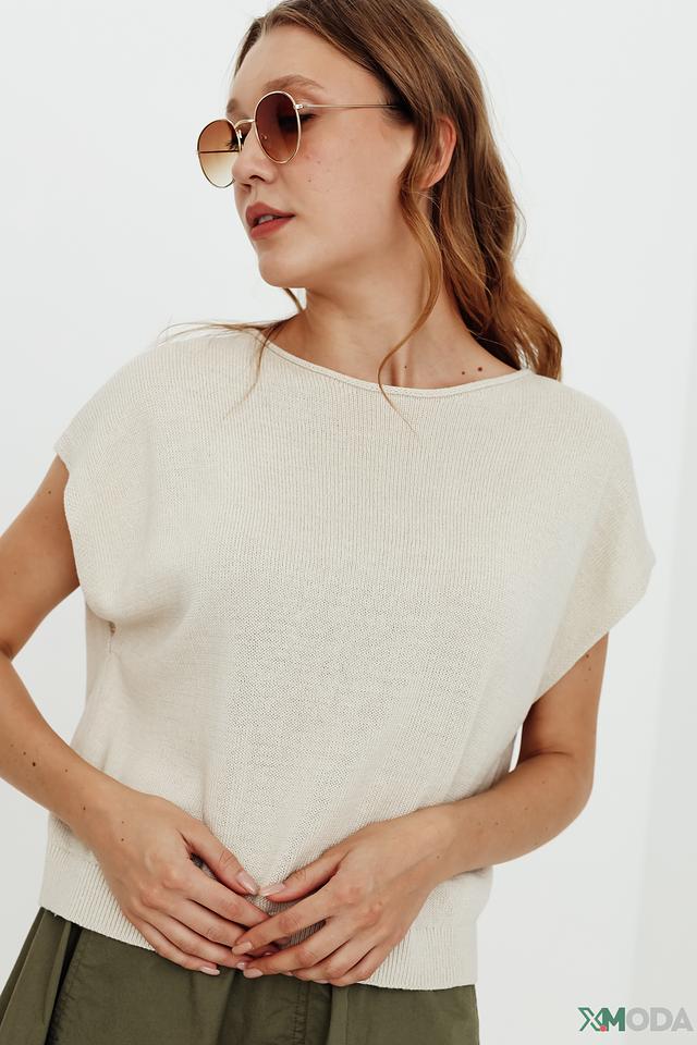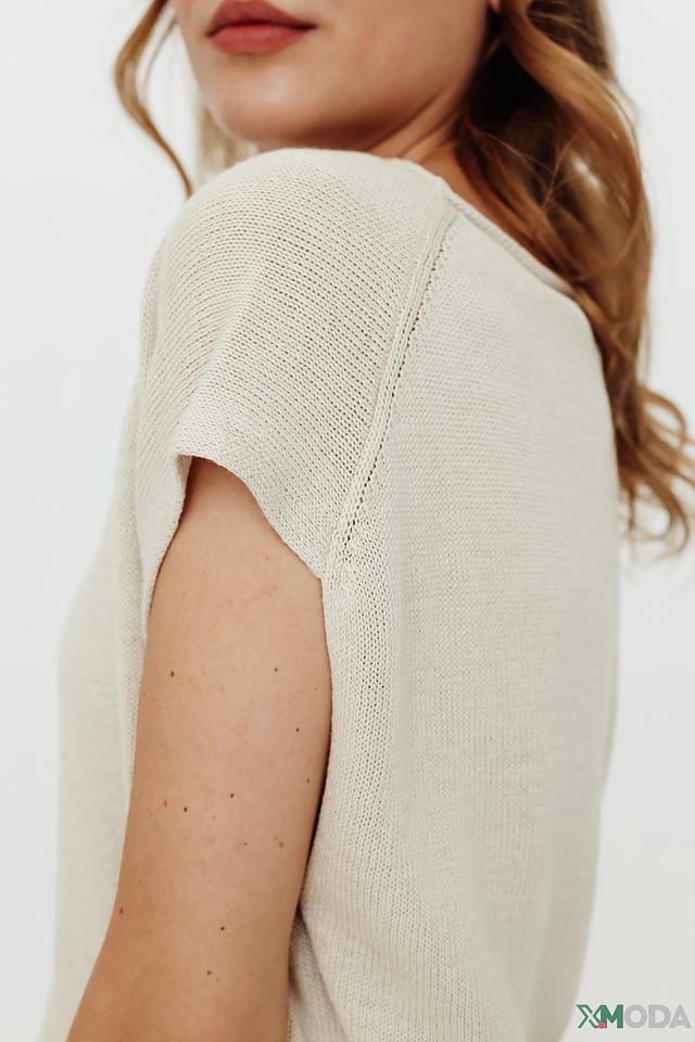 Жилет имеет свободный крой, который не сковывает движений, и округлый вырез горловины. Его бежевый цвет легко сочетается с различными элементами одежды, позволяя создавать разнообразные стильные образы.