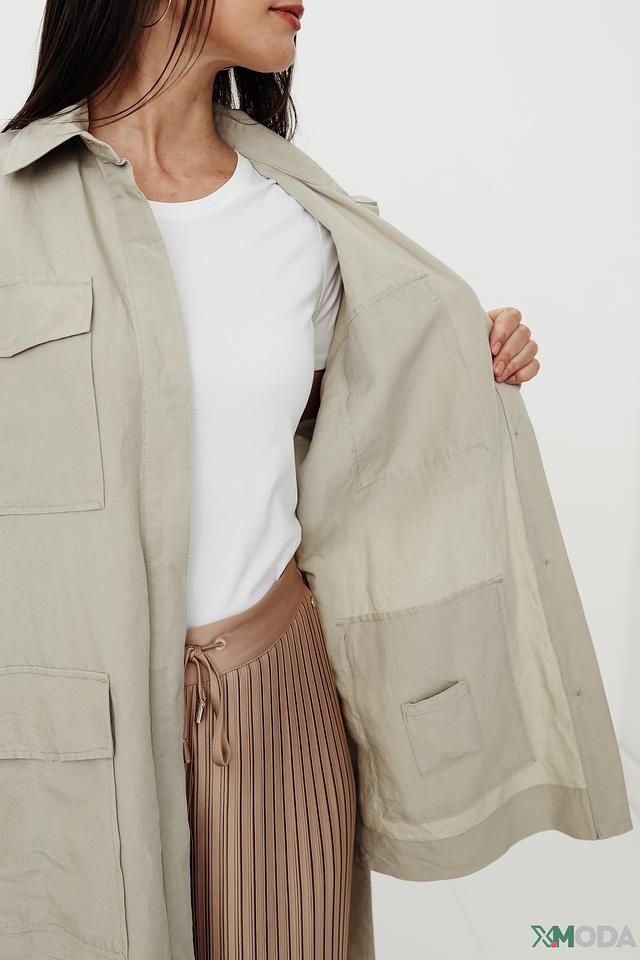 Модель дополнена двумя накладными карманами, которые не только добавляют функциональности, но и подчеркивают лаконичный дизайн. Жакет изготовлен из высококачественного материала, в составе которого 55% лиоцел и 45% лен, что обеспечивает приятные тактильные ощущения и воздухопроницаемость.