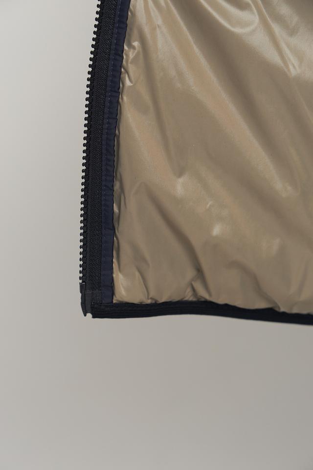 Куртка выполнена в темно-синем цвете и имеет стеганую фактуру, что придает ей современный вид. Застежка – молния. Воротник – стойка.