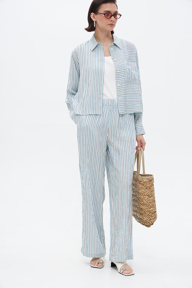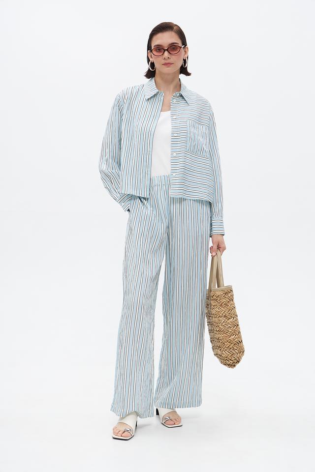 Модель имеет прямой крой и широкие штанины, создающие расслабленный и современный силуэт. Эластичный пояс обеспечивает удобную посадку по фигуре. Брюки выполнены в оригинальной полосатой расцветке, сочетающей в себе голубые, белые и серые оттенки.
