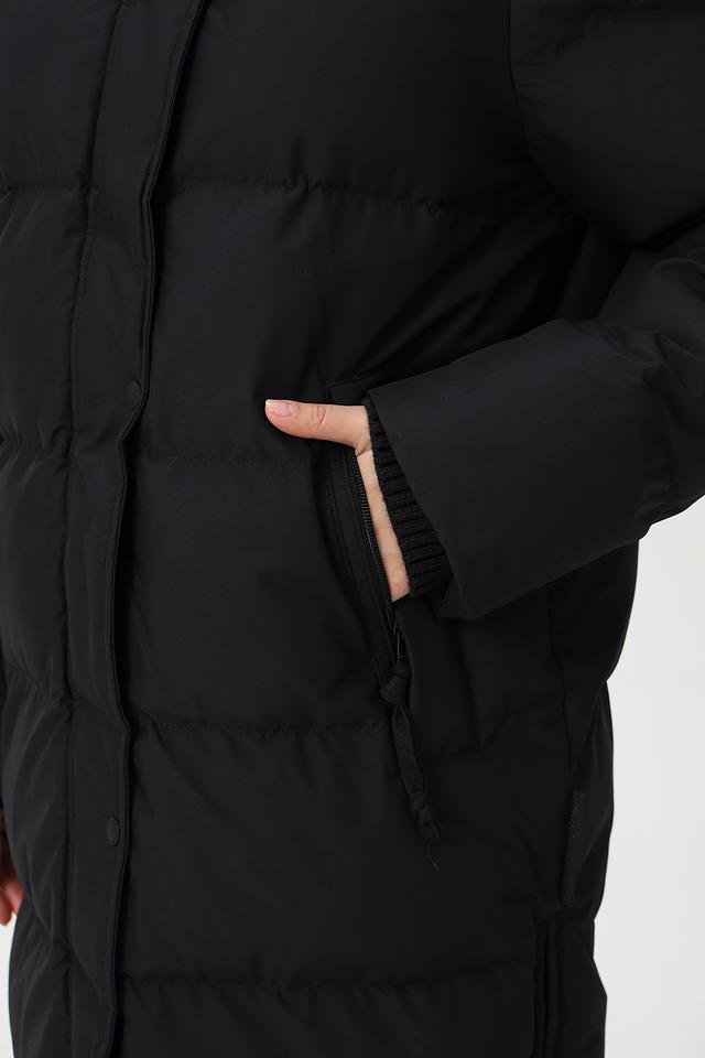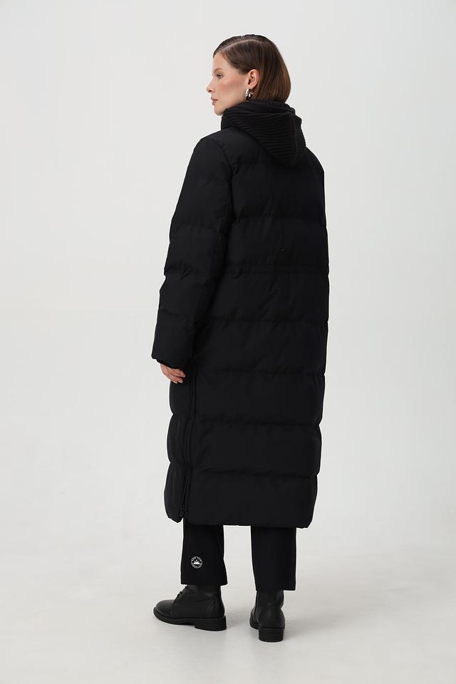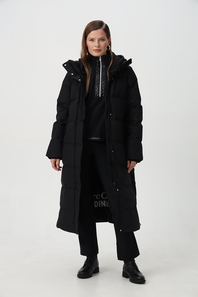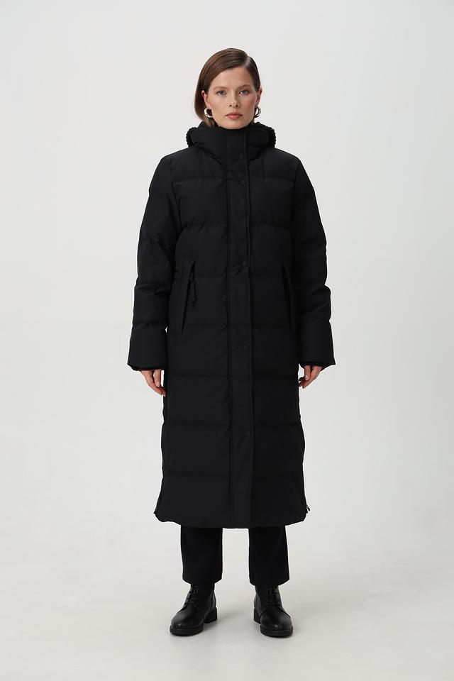 Пальто имеет длину макси и прямой крой, который подчеркивает силуэт и обеспечивает комфорт в движении. Капюшон защитит от ветра и непогоды, а застежка-молния позволяет регулировать степень теплоизоляции.