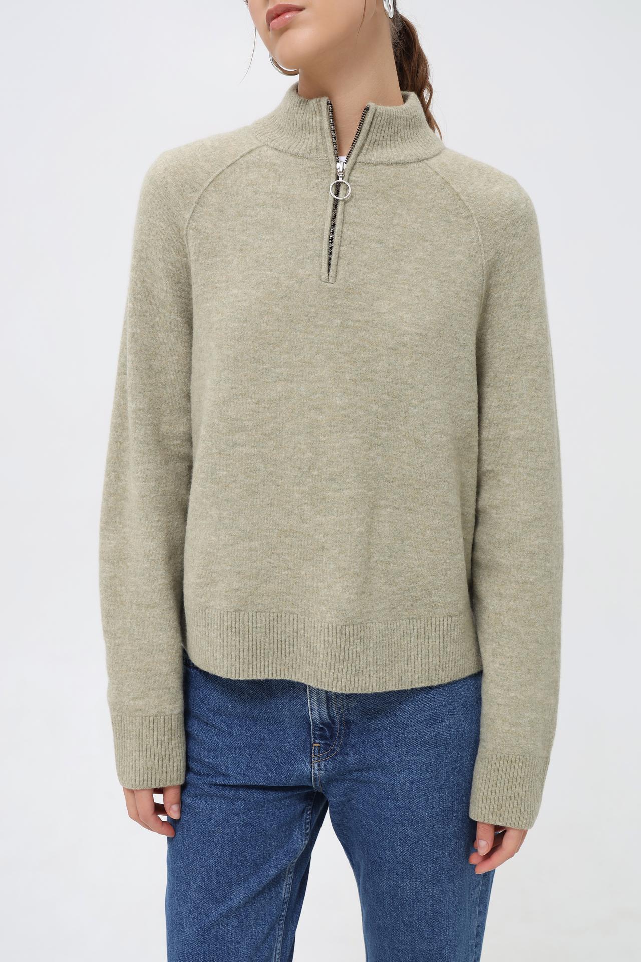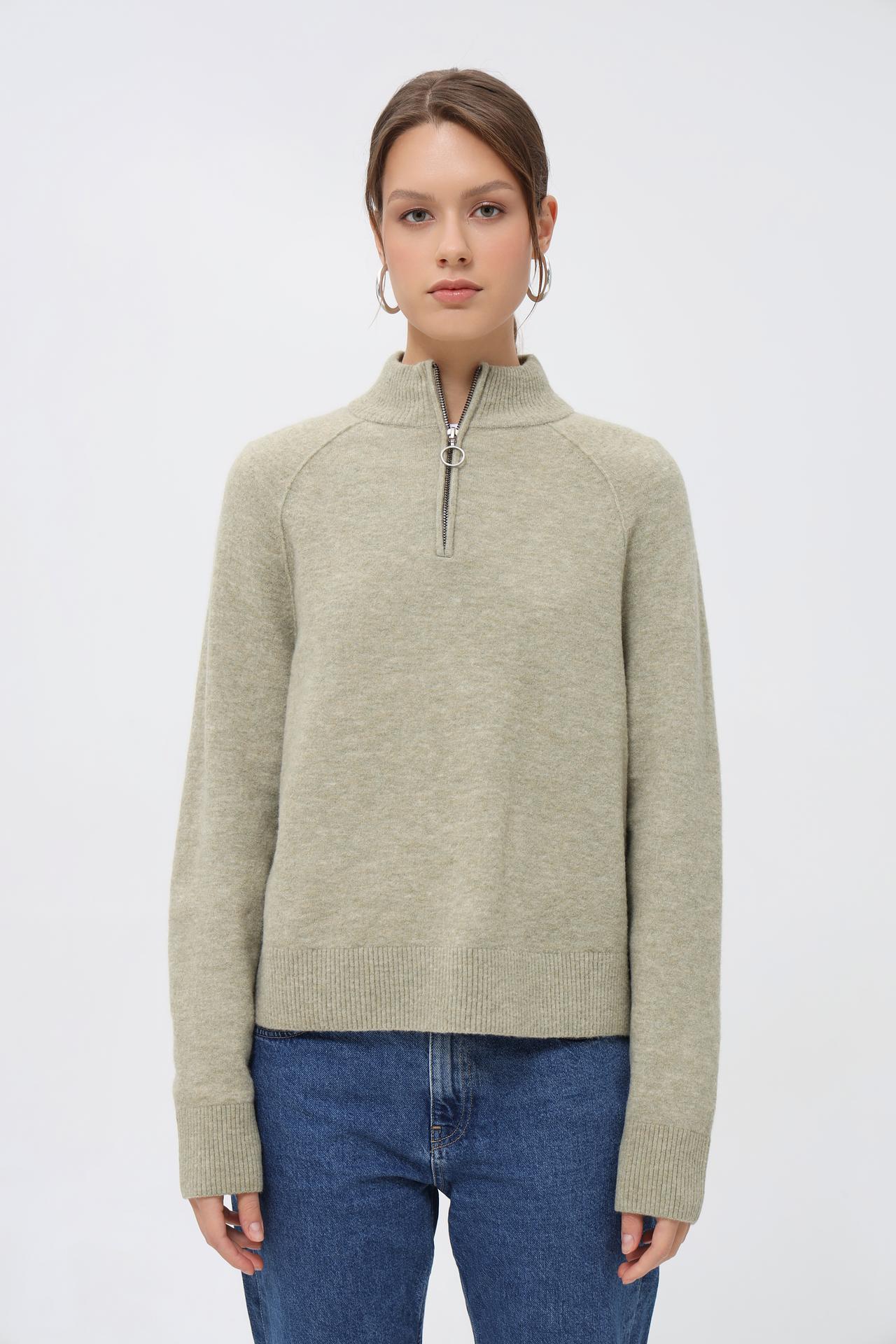 - Дизайн: Укороченная модель с высоким воротником и застежкой-молнией на половину изделия. Такой дизайн придает пуловеру современный вид и позволяет регулировать степень прилегания воротника.