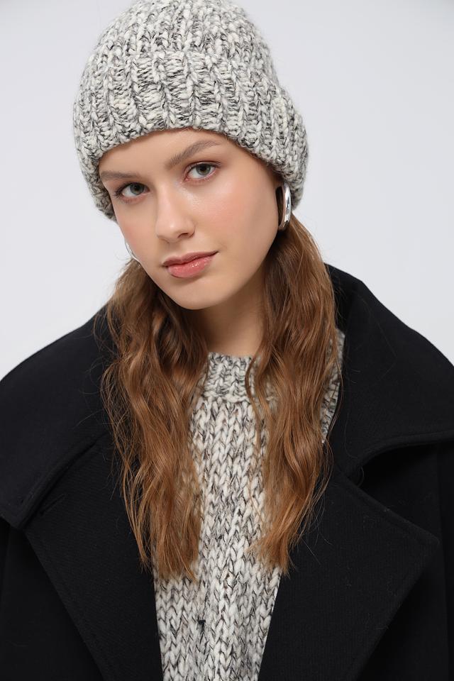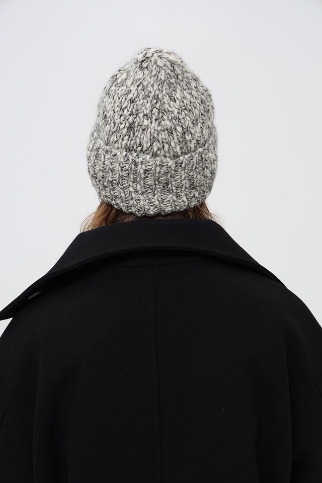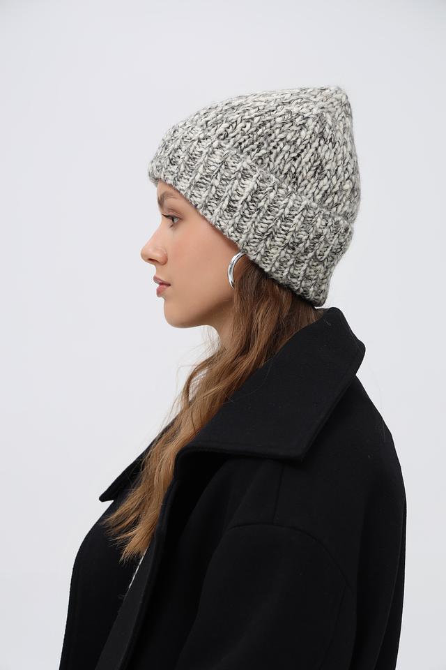 Шапка выполнена в сером цвете с меланжевым эффектом, создающим интересный визуальный эффект. Текстура вязки добавляет изделию объём и уют.