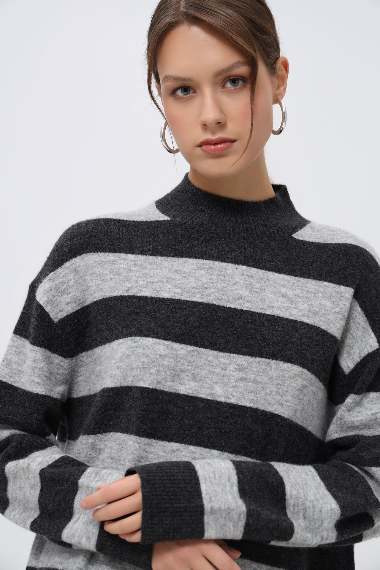 - Дизайн: Классический прямой силуэт с высоким воротником-стойкой и актуальным принтом в горизонтальную полоску. Этот пуловер легко впишется в различные образы, от кэжуал до более элегантных.