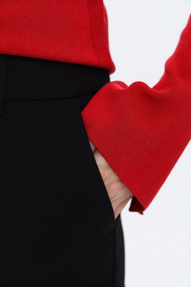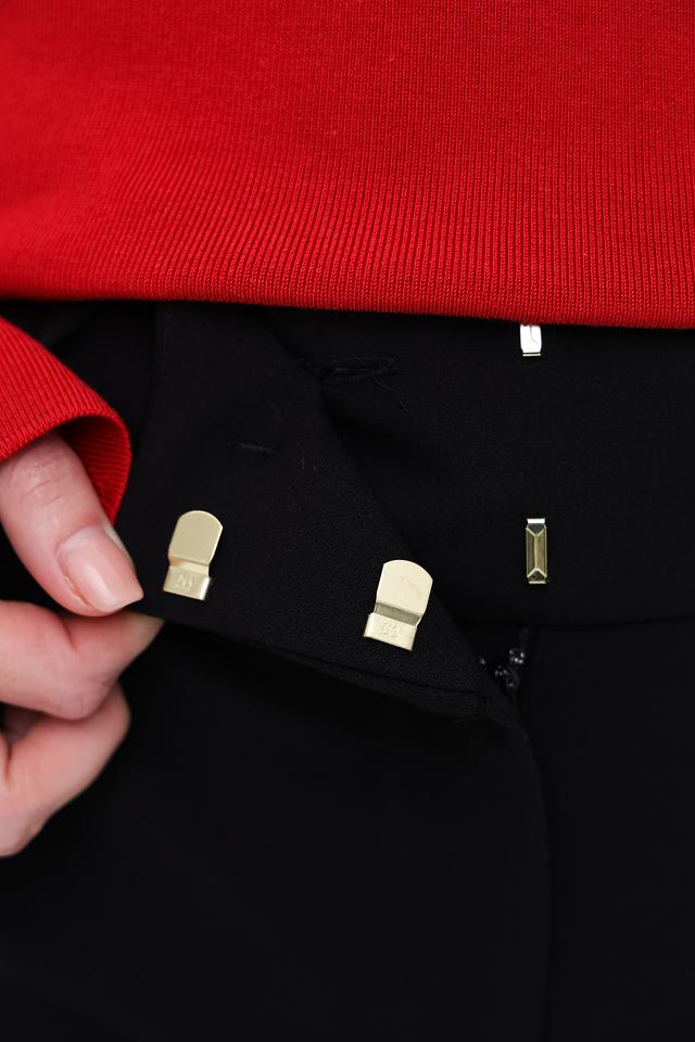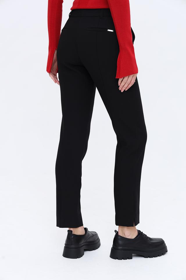 Брюки имеют прямой крой, который визуально вытягивает силуэт и обеспечивает свободу движений. Высокая посадка подчеркивает талию и создает женственный образ. Застежка на молнию и пуговицу обеспечивает надежную фиксацию.