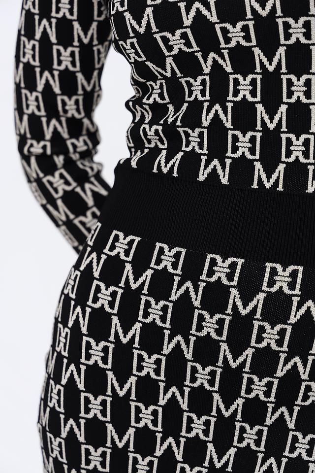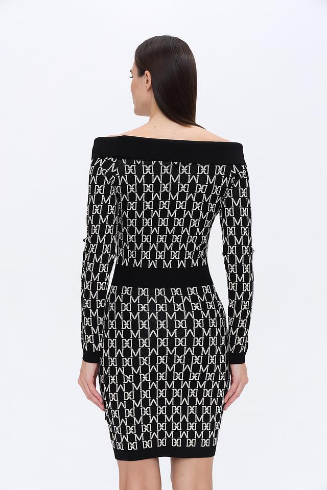 Вся поверхность платья покрыта повторяющимся логотипом бренда, создавая эффектный и запоминающийся образ. Платье имеет приталенный силуэт, который подчеркивает достоинства фигуры.