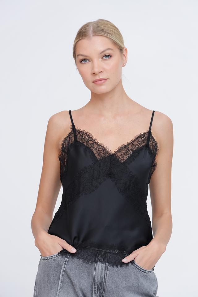 Изящный топ Marciano чёрного цвета с деликатным кружевным декором. Модель на тонких бретелях, выполненная из гладкого полиэстера, станет стильным дополнением к вашему гардеробу. Состав: полиэстер 100%