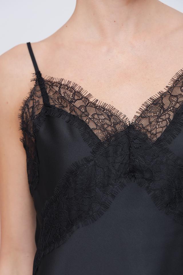 Модель имеет классический крой на тонких бретелях, что подчеркивает изящество линий плеч и шеи. Особый шарм изделию придаёт деликатный кружевной декор по горловине и нижнему краю, добавляющий романтичности и привлекательности.