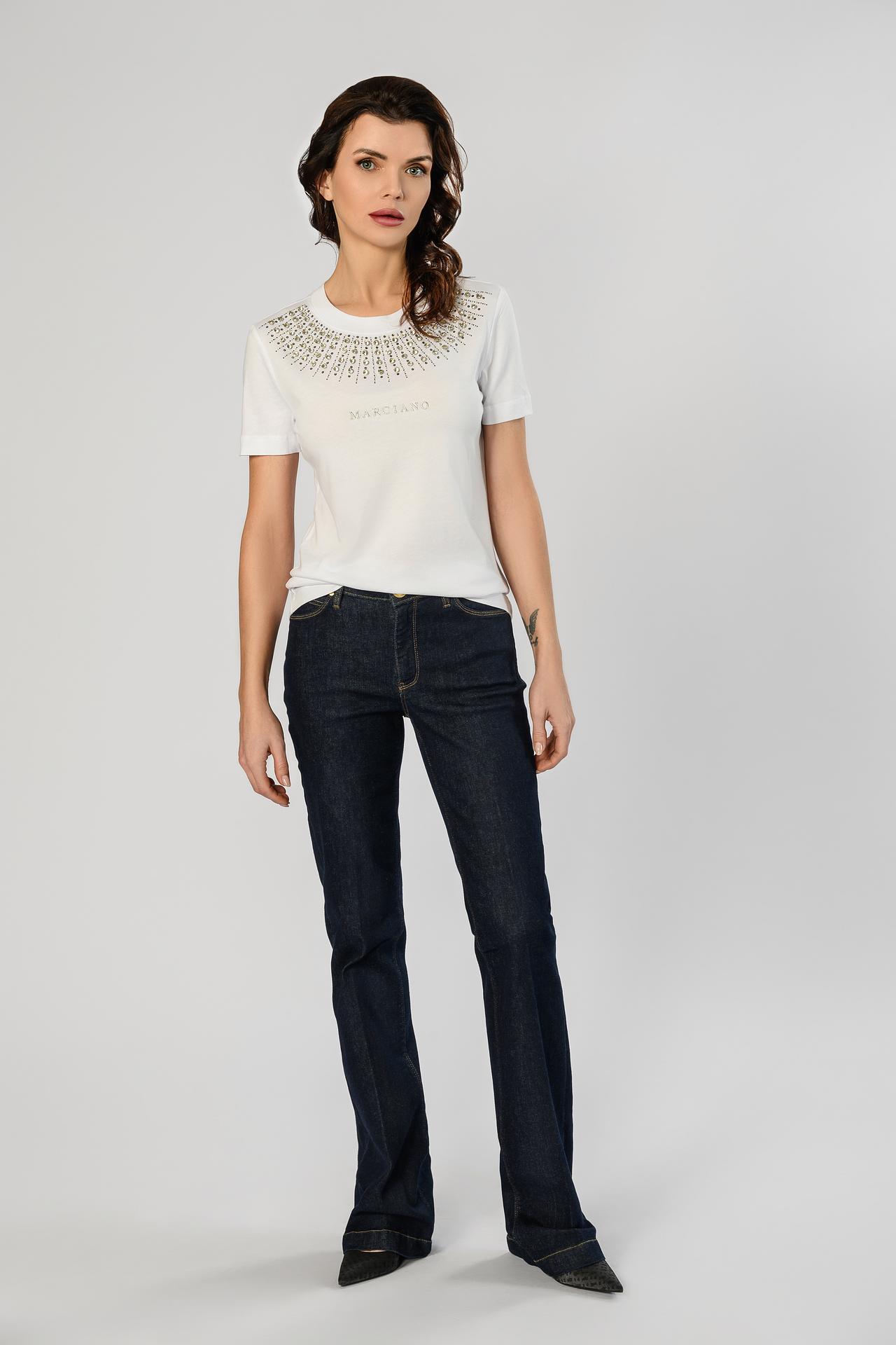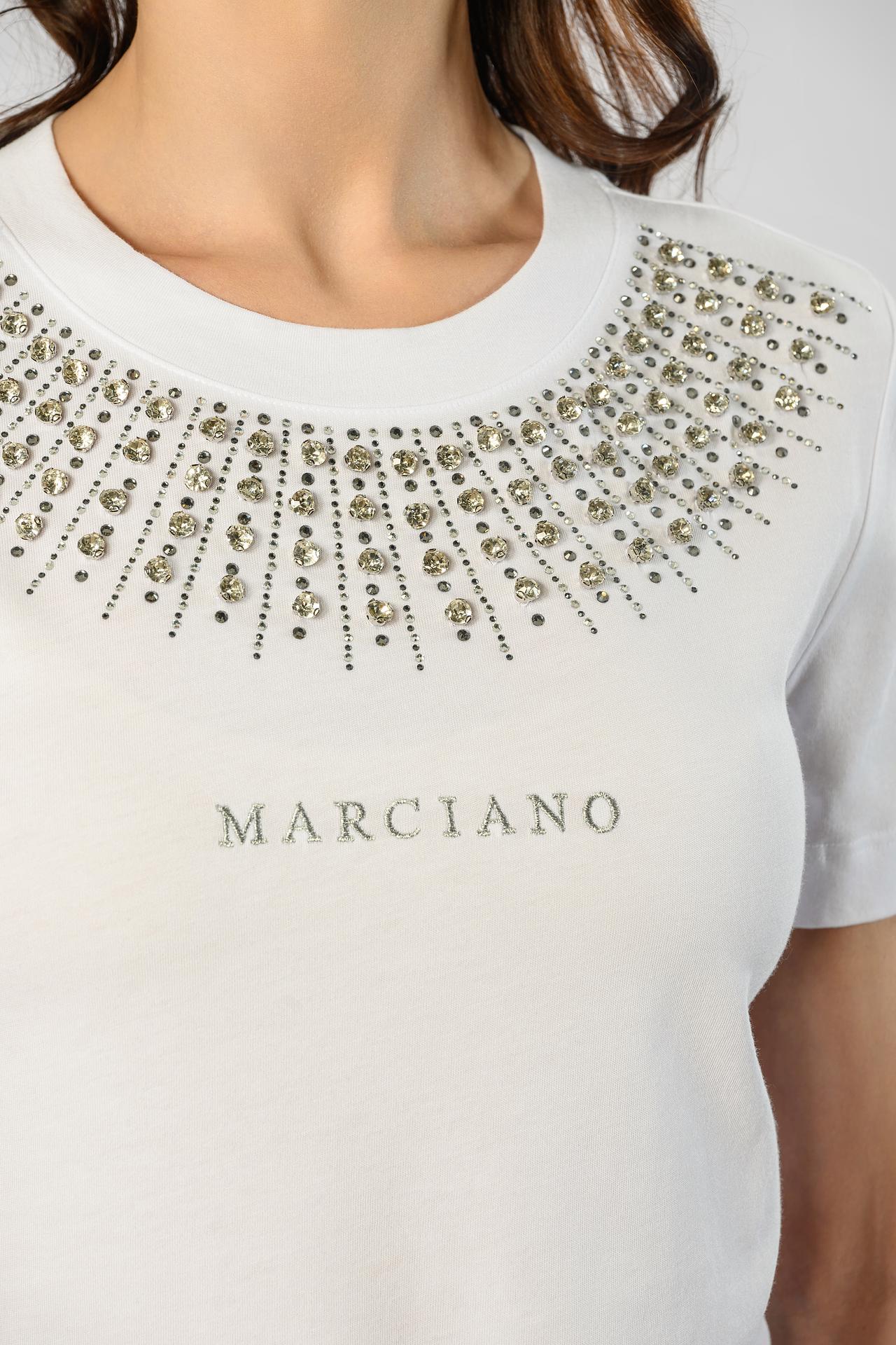 - Универсальность. Белая футболка Marciano легко интегрируется в любой гардероб. Она идеально подходит для создания как casual, так и более формальных ансамблей с юбками или брюками.