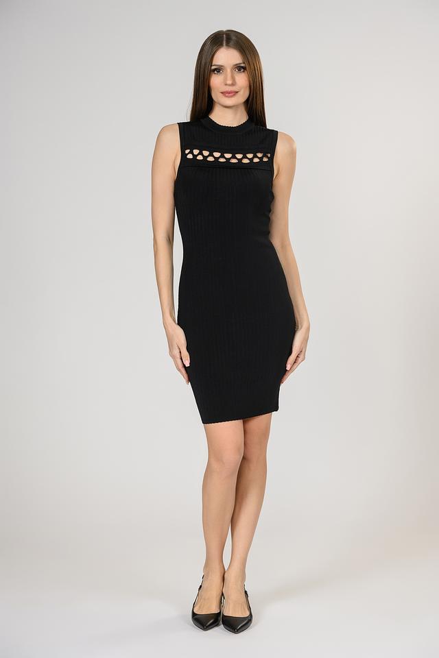 Платье имеет длину до колена и классический чёрный цвет. Особый акцент сделан на вырезы на лифе, которые придают образу пикантность и оригинальность. Высокий круглый вырез горловины дополнен декоративной обработкой.