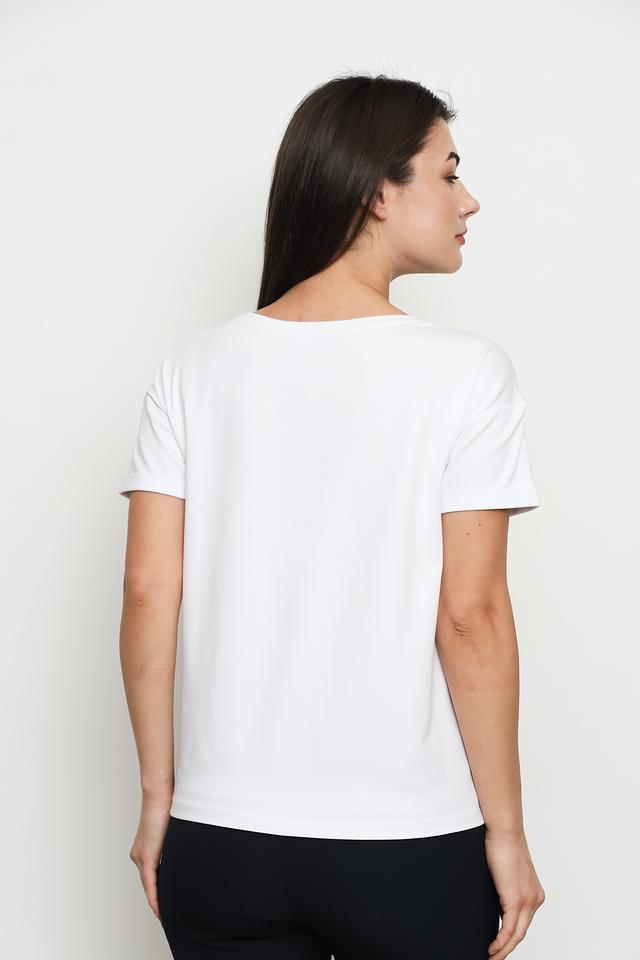 Футболка имеет прямой крой, короткие рукава и круглый вырез горловины. Состав ткани: 96% хлопок, 4% эластан. Эта модель идеально подходит для создания повседневных образов, сочетаясь с джинсами, шортами или юбками.
