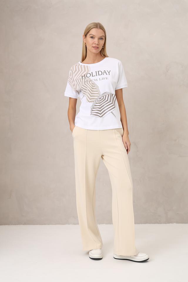 Основной цвет футболки – белый, который служит идеальным фоном для оригинального принта. Дизайн украшен изображением пляжных зонтиков в полоску и надписью "HOLIDAY BEACH LIFE", выполненной в сочетании графитовых и серебристых оттенков.