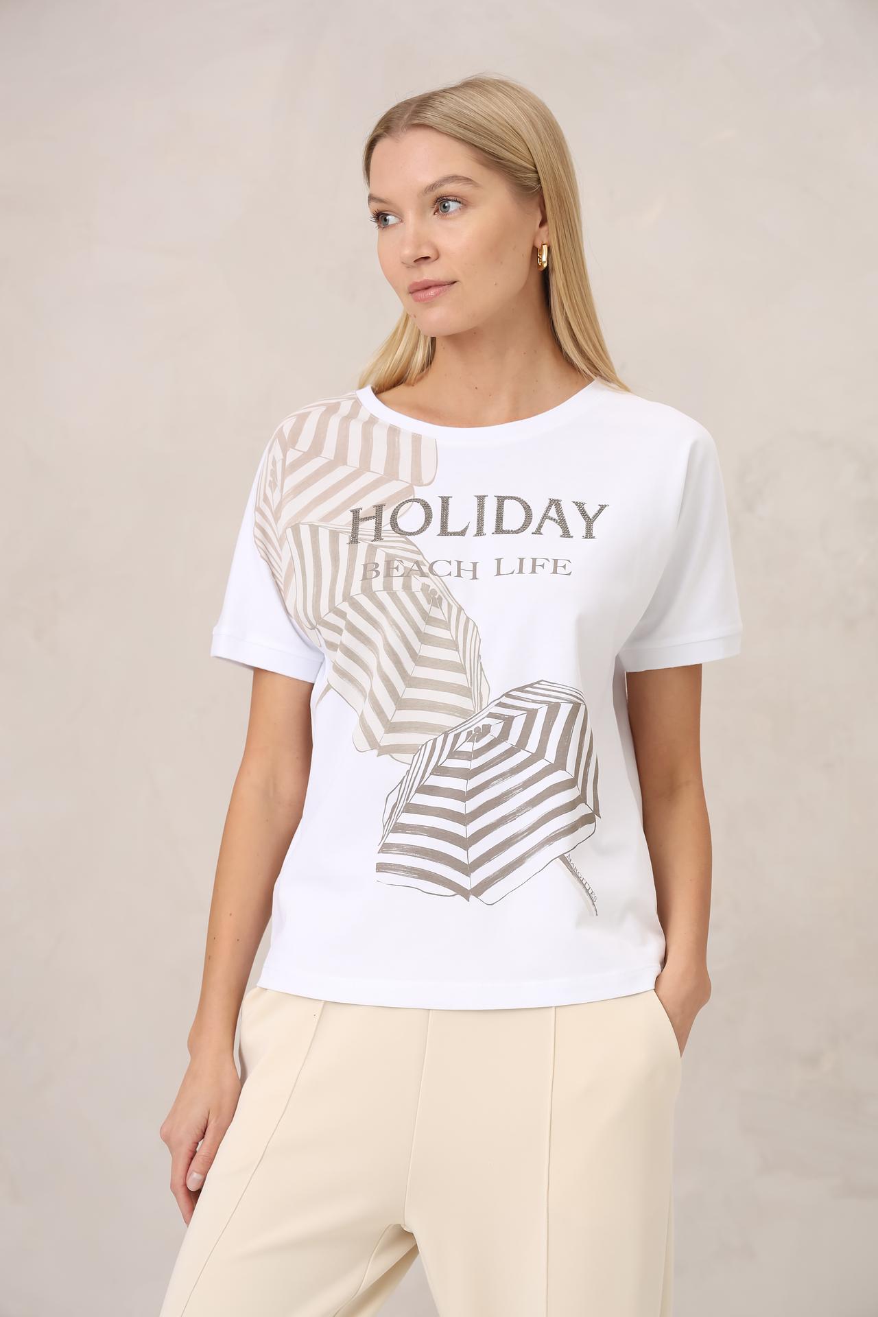 Эта стильная женская футболка от Margittes станет прекрасным дополнением к вашему гардеробу. Выполнена из 100% хлопка, обеспечивая комфорт и мягкость в течение всего дня. Актуальный принт с надписью придает образу неповторимость и подчеркивает ваш индивидуальный стиль.