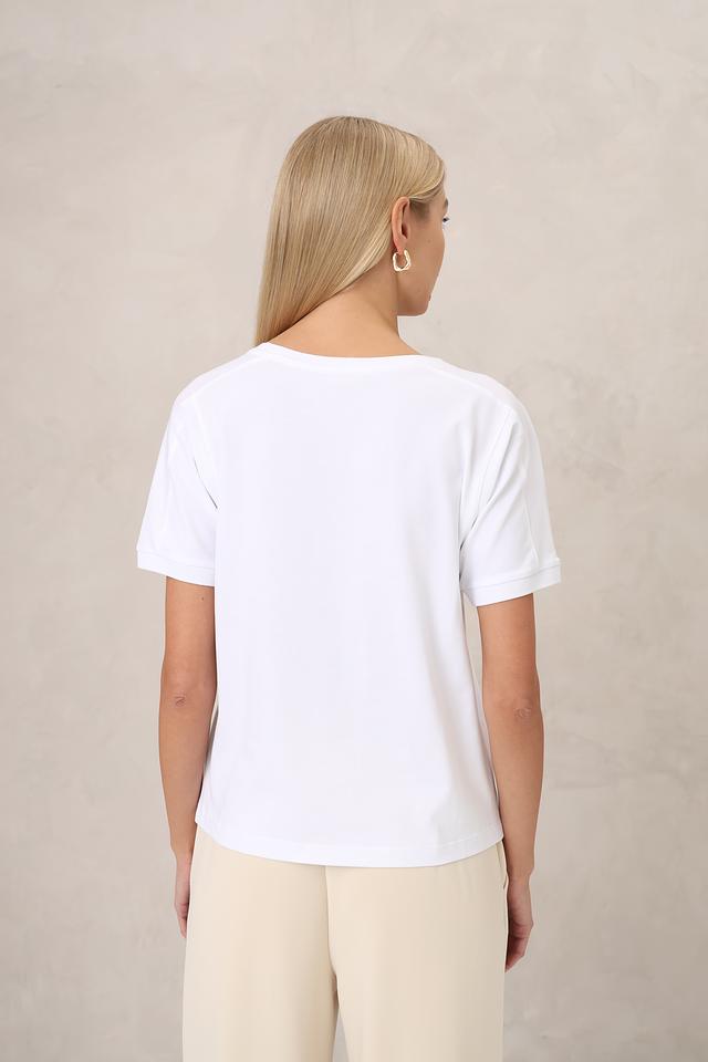 Круглый вырез горловины и короткие рукава обеспечивают классический и универсальный силуэт. Футболка идеально подходит для создания повседневных образов, сочетаясь с джинсами, шортами или юбками.