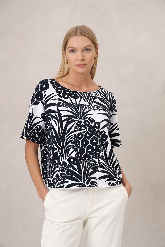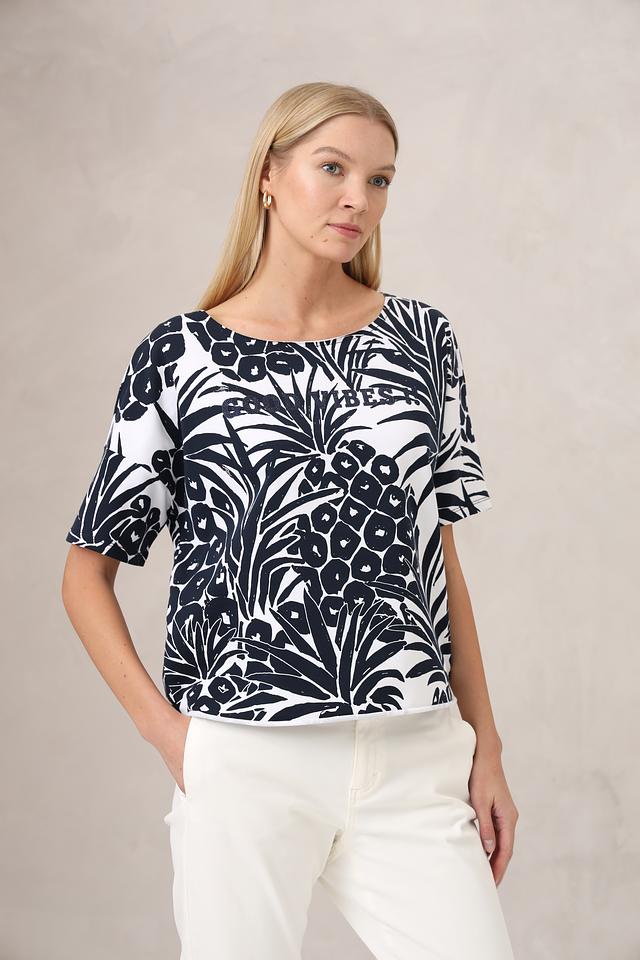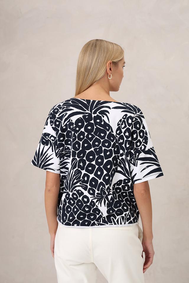 Блуза имеет свободный крой и короткие рукава, что делает её идеальным выбором для тёплой погоды. Основной цвет блузы – белый, а главным акцентом является эффектный чёрно-белый принт с изображением тропических листьев и ананасов.