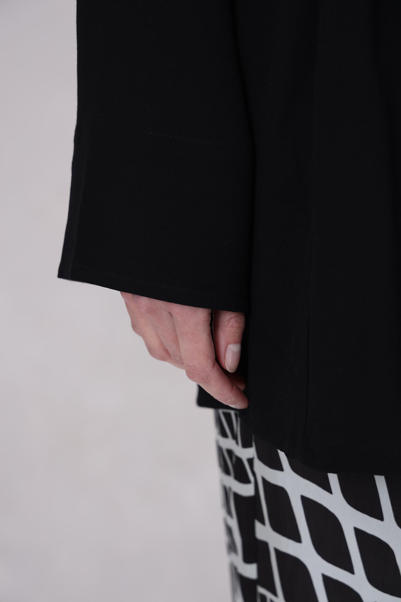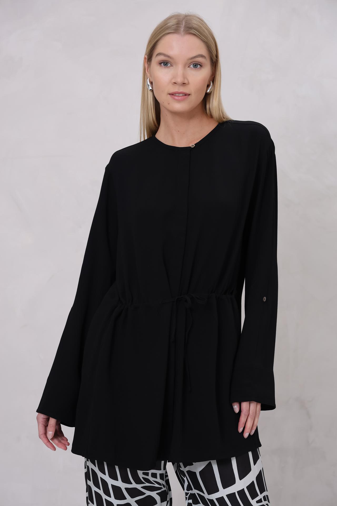 - Дизайн: Прямой силуэт, круглый вырез с декоративной пуговицей, длинные рукава с возможностью фиксации длины.