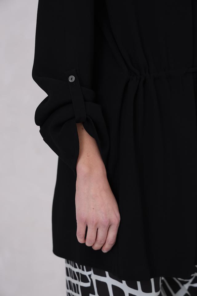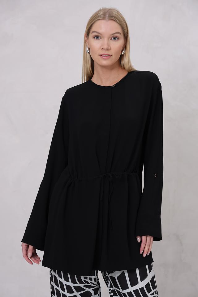 Чёрная блуза от Margittes выполнена из мягкого лиоцела и имеет удобную завязку на талии. Свободный крой и длинные рукава делают эту модель идеальной для создания комфортных и стильных образов. Состав: лиоцел 100%