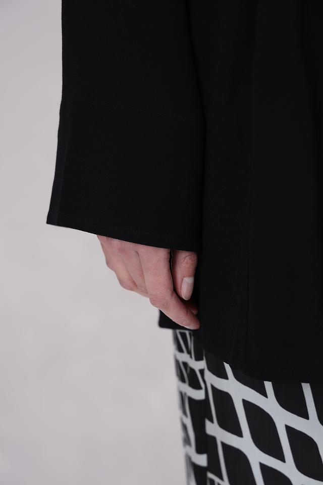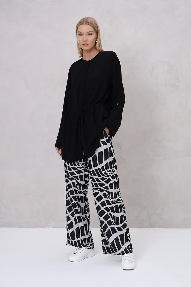 Блуза имеет свободный крой, который не сковывает движения, и длинные рукава. Завязка на талии позволяет подчеркнуть фигуру и создать более женственный силуэт. Вырез горловины оформлен небольшим круглым отверстием с пуговицей.
